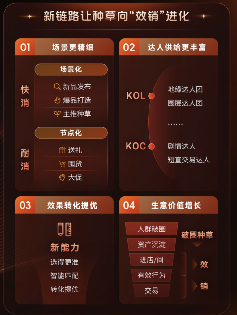 信号联动后,品聚等品牌广告产品负责在内容场触达更广泛的破圈人群,营销科学和大模型能力负责对这些沉淀下来的种草人群做结构化解析,建立“人—品—类目—内容”的准确关联,交易场(无论是广告交易还是自然成交)则在此基础上调用这些信号进行分发和出价决策,这意味着品牌投放在平台侧被转化为可被调用的经营因子,持续发挥作用。