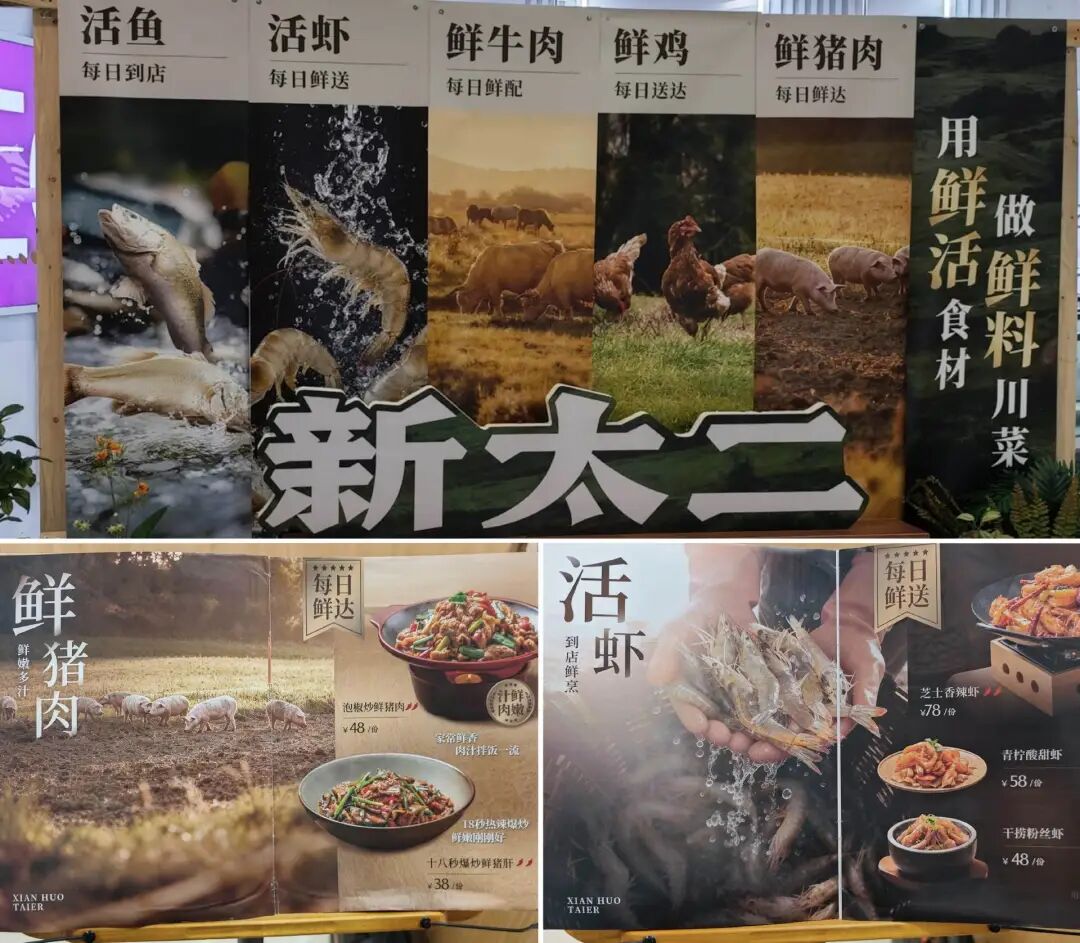 此时切入川菜全品类,本质上是将 “酸菜鱼” 这一核心爆品,升级为 “活鱼、活虾、鲜牛肉、鲜鸡、鲜猪肉”的产品矩阵。而在酸菜鱼之后,消费者能否为“N个潜力爆品”买单,则是太二的关键考验。