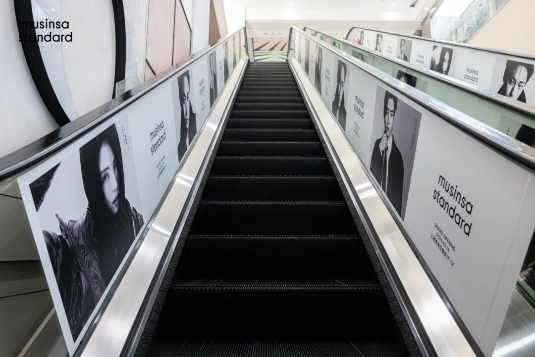 淮海百盛对于MUSINSA STANDARD的到来,也表现出来了足够的诚意,外立面、商场内广告牌以及扶梯都官宣了MUSINSA STANDARD开业的消息。