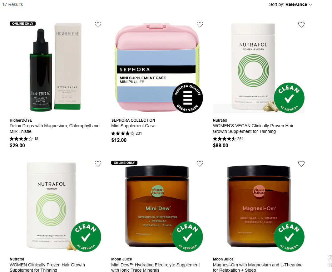 但增长势态并未持续太久。近年来,丝芙兰的补充剂货架开始悄然变化:多个中小品牌陆续下架,品类SKU持续精简。截至发稿前,丝芙兰美国官网显示的美容补充剂产品仅剩17款,已不足20款,与巅峰时期的上百款形成鲜明对比。