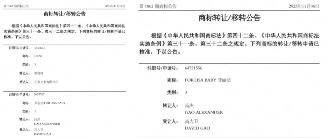 除此之外,“菲丽洁FORLISA BABY”(注册号:5652707)与“FORLISA BABY (注册号:64721556)菲丽洁”的第3类商标的申请人均为David Gao(中文名:高大卫)。2023年,上述两个商标均被David Gao转让给了GAO ALEXANDER(中文名:高杰)。目前,两款商标均处于“已注册”状态。