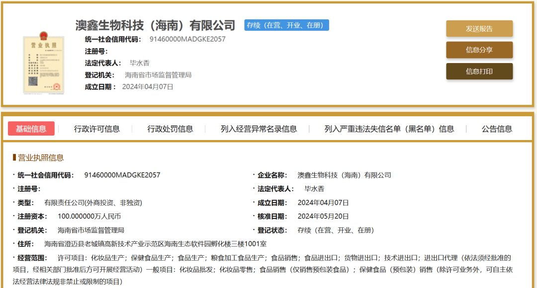 巧合的是,据企查查信息显示,深圳澳丽达的法定代表人和实际控制人ALEXANDER GAO,与海南澳鑫生物的实控人David Gao的国籍均为澳大利亚,且深圳澳丽达的监事也名为David Gao。不过,仅从股权关联上看,深圳澳丽达与海南澳鑫生物没有实际关联。