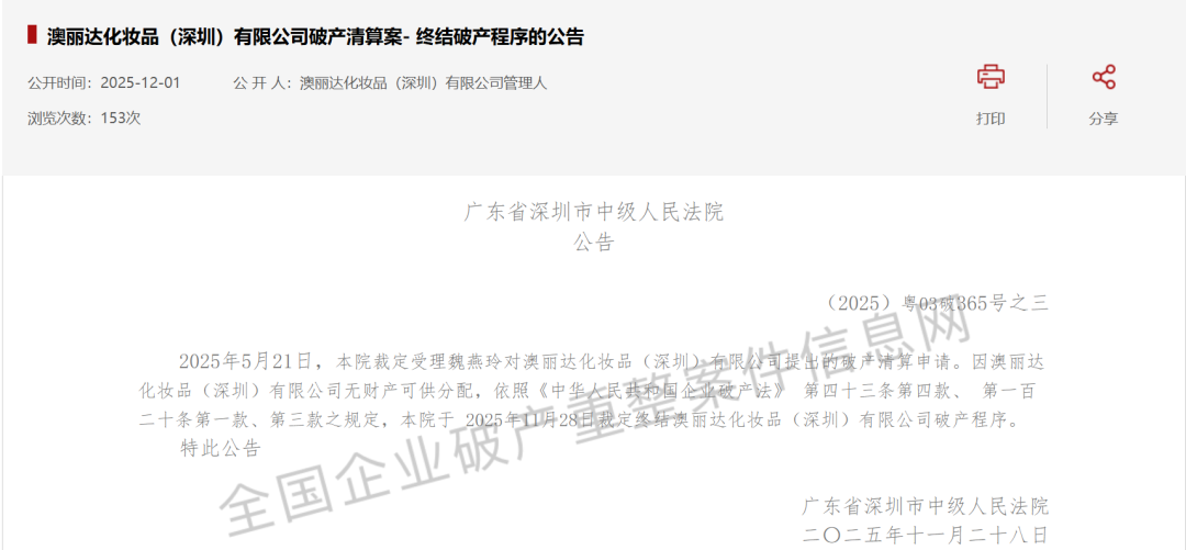 近日,根据全国企业破产重整案件信息网发布的信息显示,澳丽达化妆品(深圳)有限公司(下称:深圳澳丽达)因无财产可供分配,被广东省深圳市中级人民法院裁定终结破产程序,正式破产。