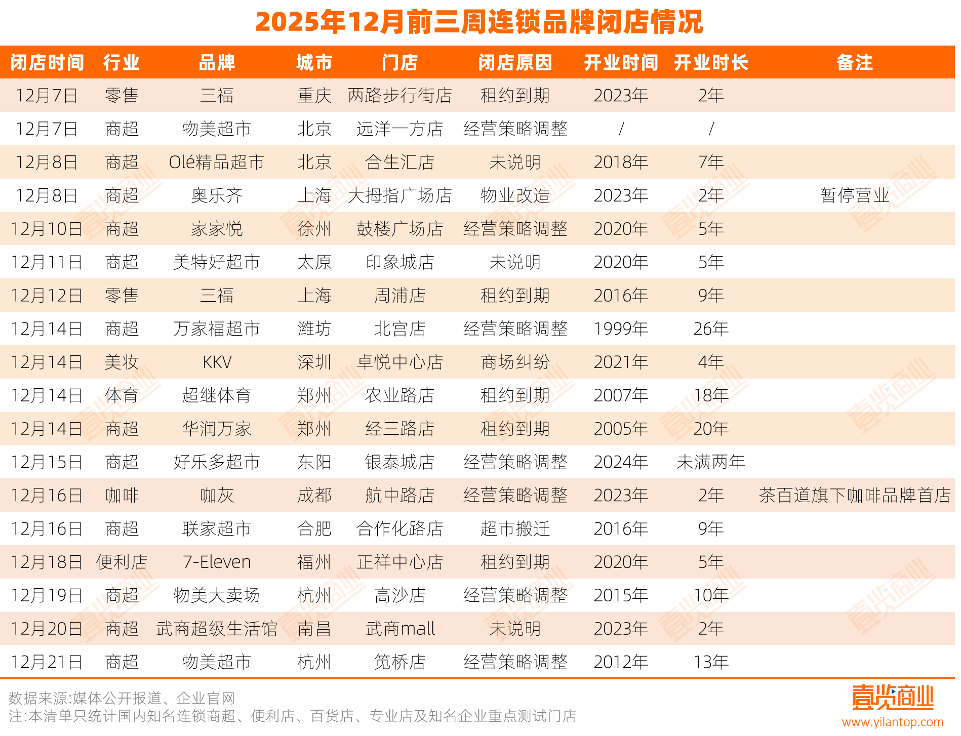 据壹览商业不完全统计,12月前三周,国内知名连锁商超、便利店、百货店、专业店及知名企业重点测试门店,共有15个连锁品牌关闭了至少19家门店。