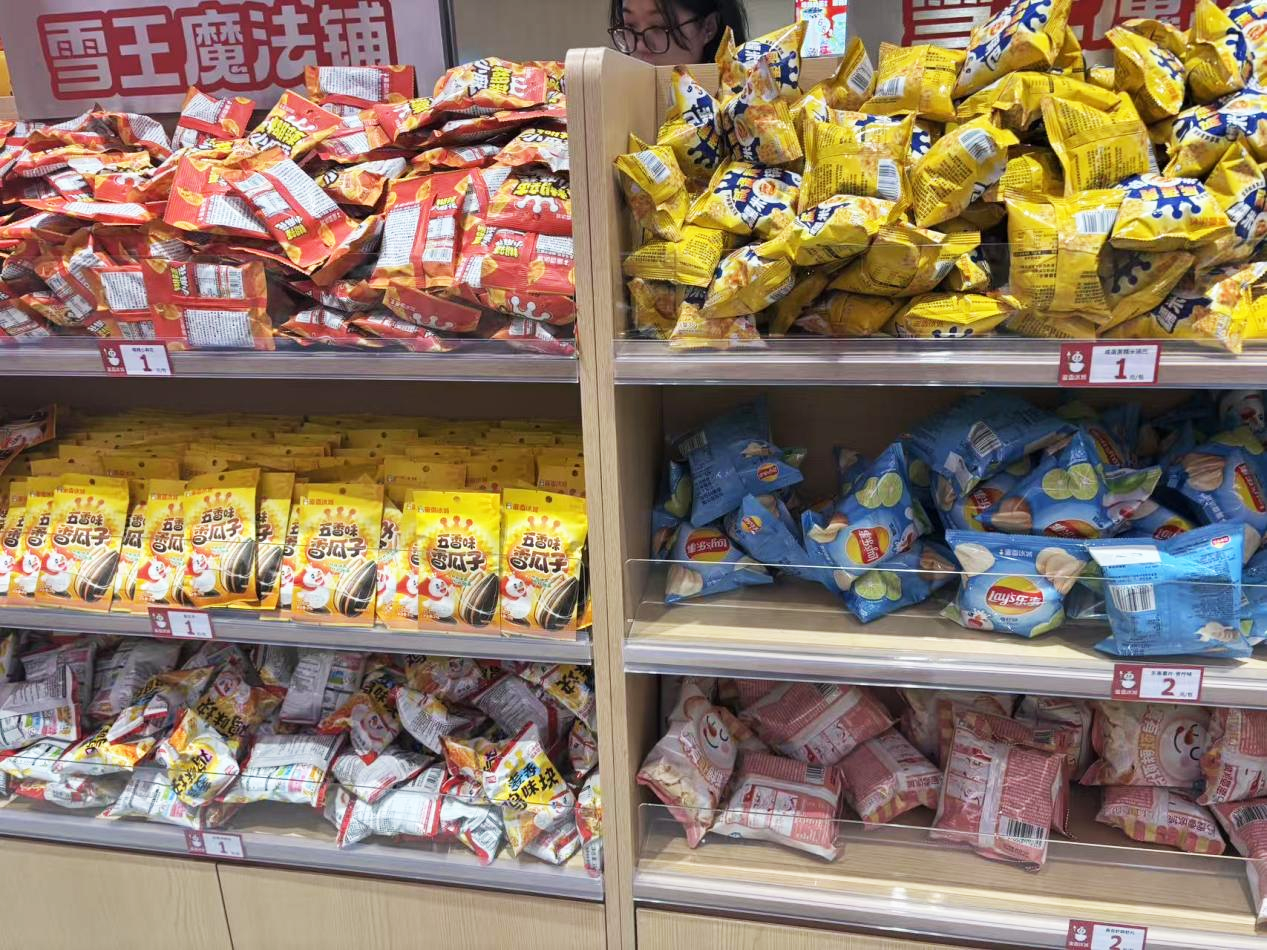 零食区则维持着蜜雪冰城的平价路线,不少袋装辣条都是单价1元,也有袋泡茶及袋装咖啡,价格在8.9到26.9的区间。