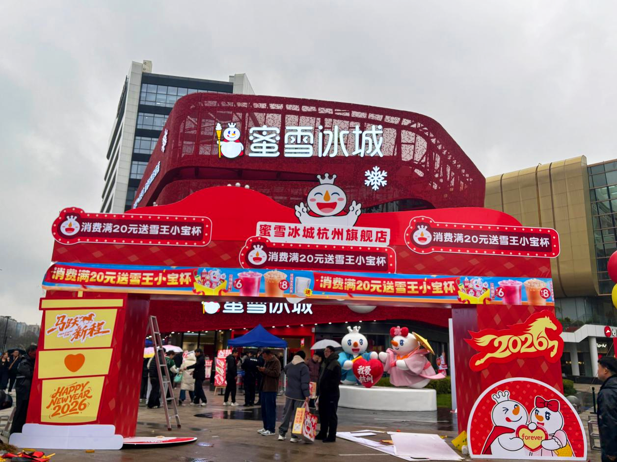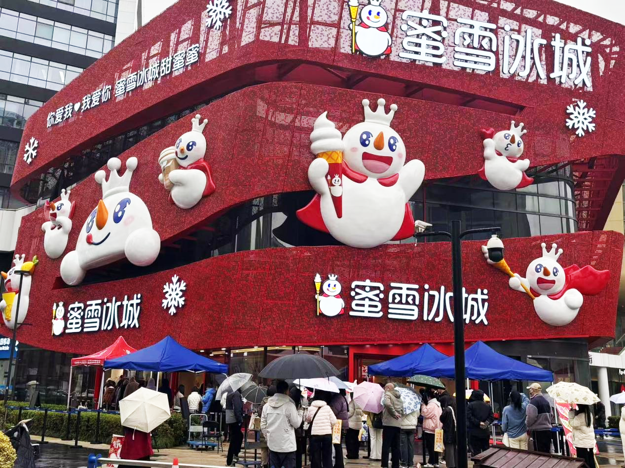 12月24日,蜜雪冰城杭州旗舰店开启试营业。这家旗舰店没有开在人流量更大的其他商圈,而是落地在了被网友戏称为“空荡如鬼城”的西溪银泰城。