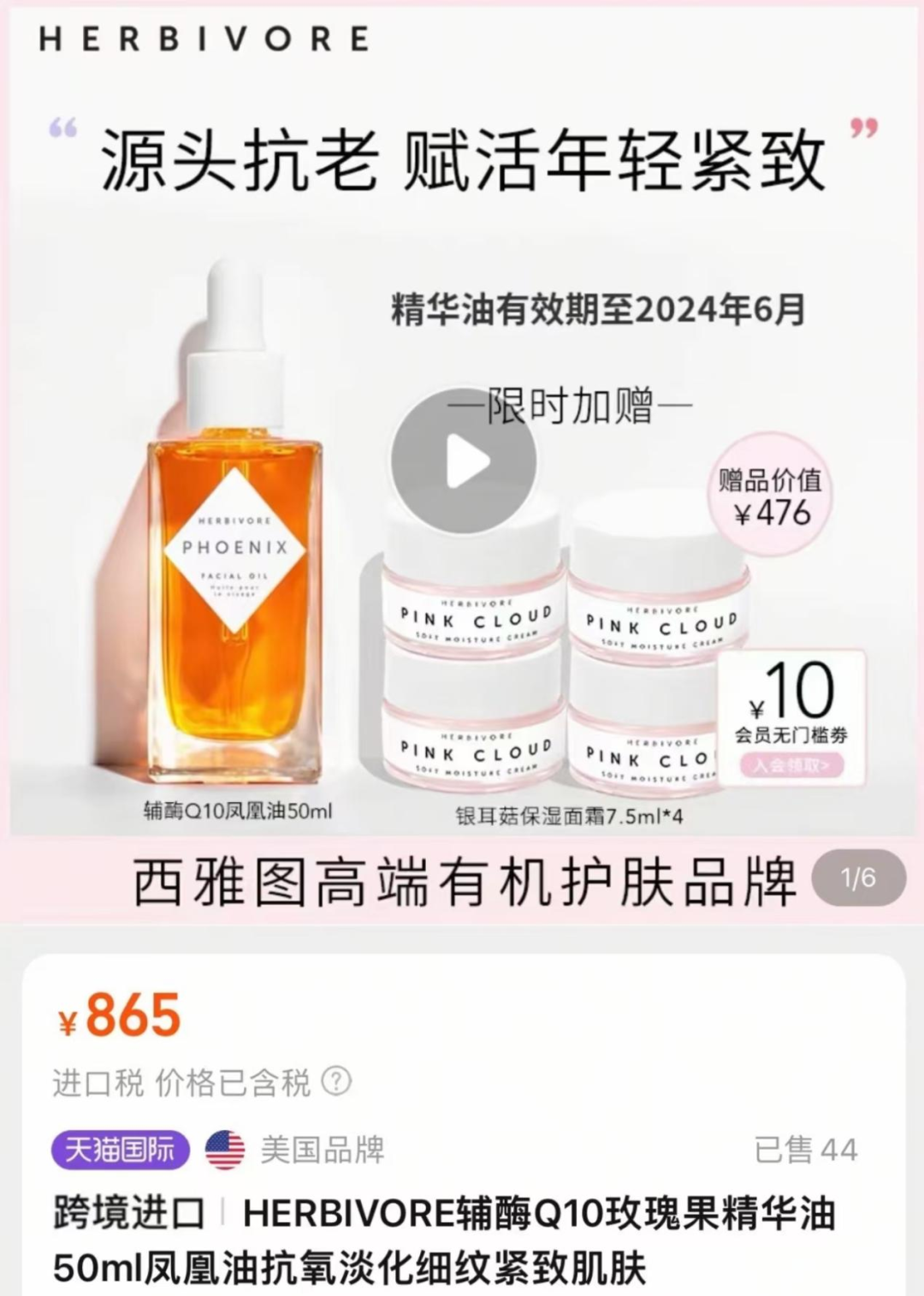过往页面显示,HERBIVORE海外旗舰店曾上架销售过多款精华油产品,价格在499元—865元不等,且在商品页面标注自己是“高端有机护肤”品牌。