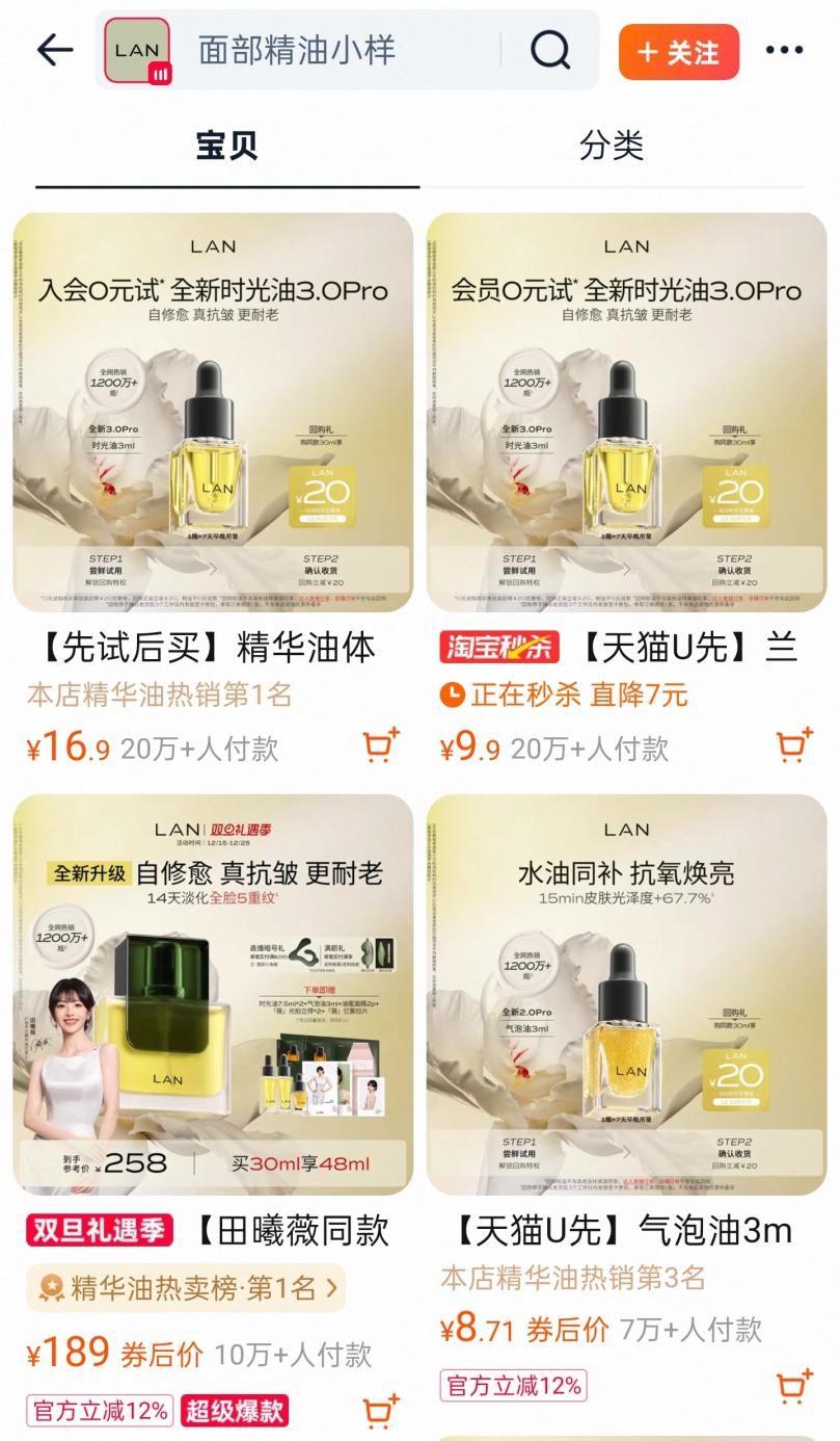 公开信息显示,LAN兰定位纯净功效护肤,于2012年创立。该品牌坚持“精净、高能”的纯净护肤定位,主打“以油养肤”产品线,代表性产品包括面部精华油、水感卸妆油等。其核心单品“LAN兰时光油3.0”,月销10万+,位列天猫面部精华油热卖榜榜首。