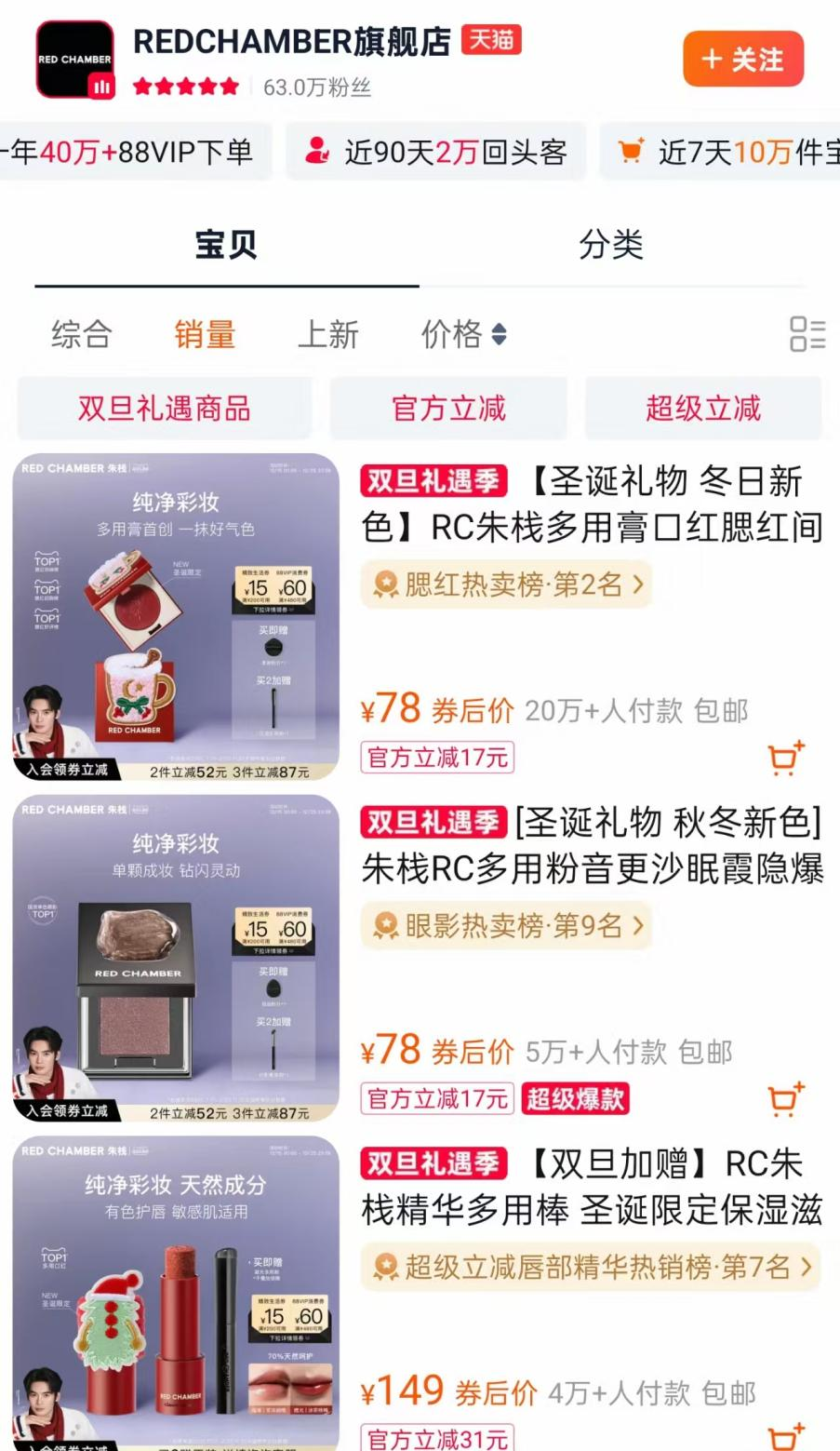 天猫旗舰店页面显示,朱栈上架了多款底妆、彩妆产品。销量最好的是“RC朱栈多用膏”,据介绍是口红、眼影、腮红一膏三用产品。店铺数据显示该产品月销量达20万+件,且位列天猫腮红热卖榜第二名。