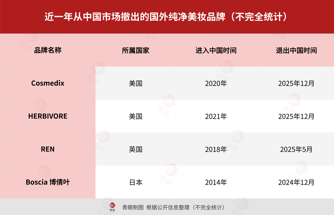 据青眼不完全统计,近一年来,除了HERBIVORE、Cosmedix在中国遭遇挫折外,还有联合利华旗下纯净美妆品牌REN、日本FANCL集团旗下纯净美妆品牌Boscia 博倩叶从中国市场撤出。