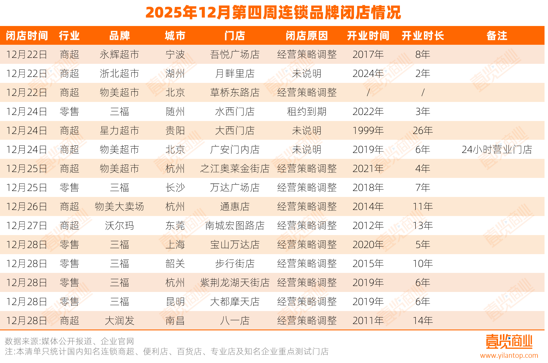 据壹览商业不完全统计,12月第四周,国内知名连锁商超、便利店、百货店、专业店及知名企业重点测试门店,共有7个连锁品牌关闭了至少15家门店。