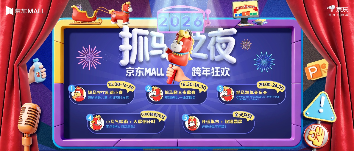 随着年轻一代逐渐成为跨年活动的主力军,传统的仪式感正在被重新定义,全国京东MALL正陆续推出形式多样的跨年活动。其中,南京、长沙、武汉等地将于12月31日同步举办“2026抓马之夜”跨年狂欢趴。活动围绕“不必正常,主打尽兴”的主题,打造集脱口秀、音乐竞技、明星歌迷会及沉浸式游园于一体的全链路跨年体验。
