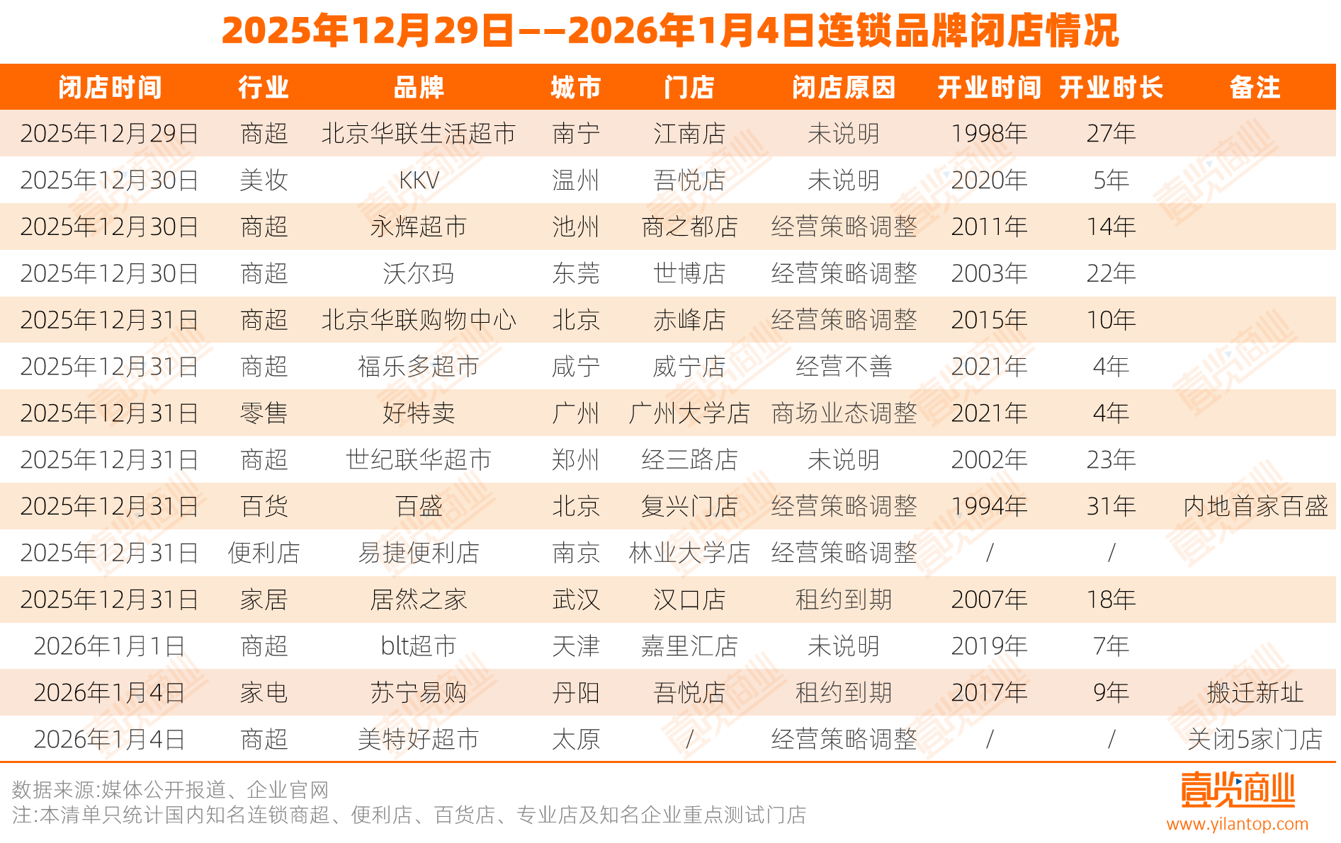 据壹览商业不完全统计,2025年12月29日——2026年1月4日,国内知名连锁商超、便利店、百货店、专业店及知名企业重点测试门店,共有14个连锁品牌关闭了至少18家门店。