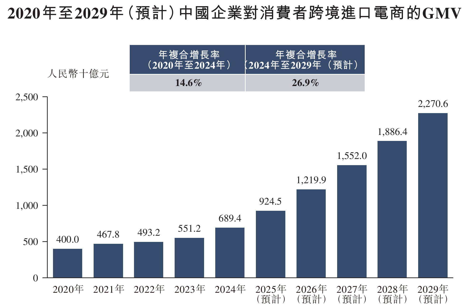 数据显示,中国企业对消费者跨境进口电商的GMV,由2020年的4000亿元增至2024年的6894亿元,预测将于2029年增至22706亿元,2024年至2029年的年复合增长率为26.9%。该市场资源壁垒较高,集中度较高,2024年前五大服务商已占据20.7%的市场份额。
