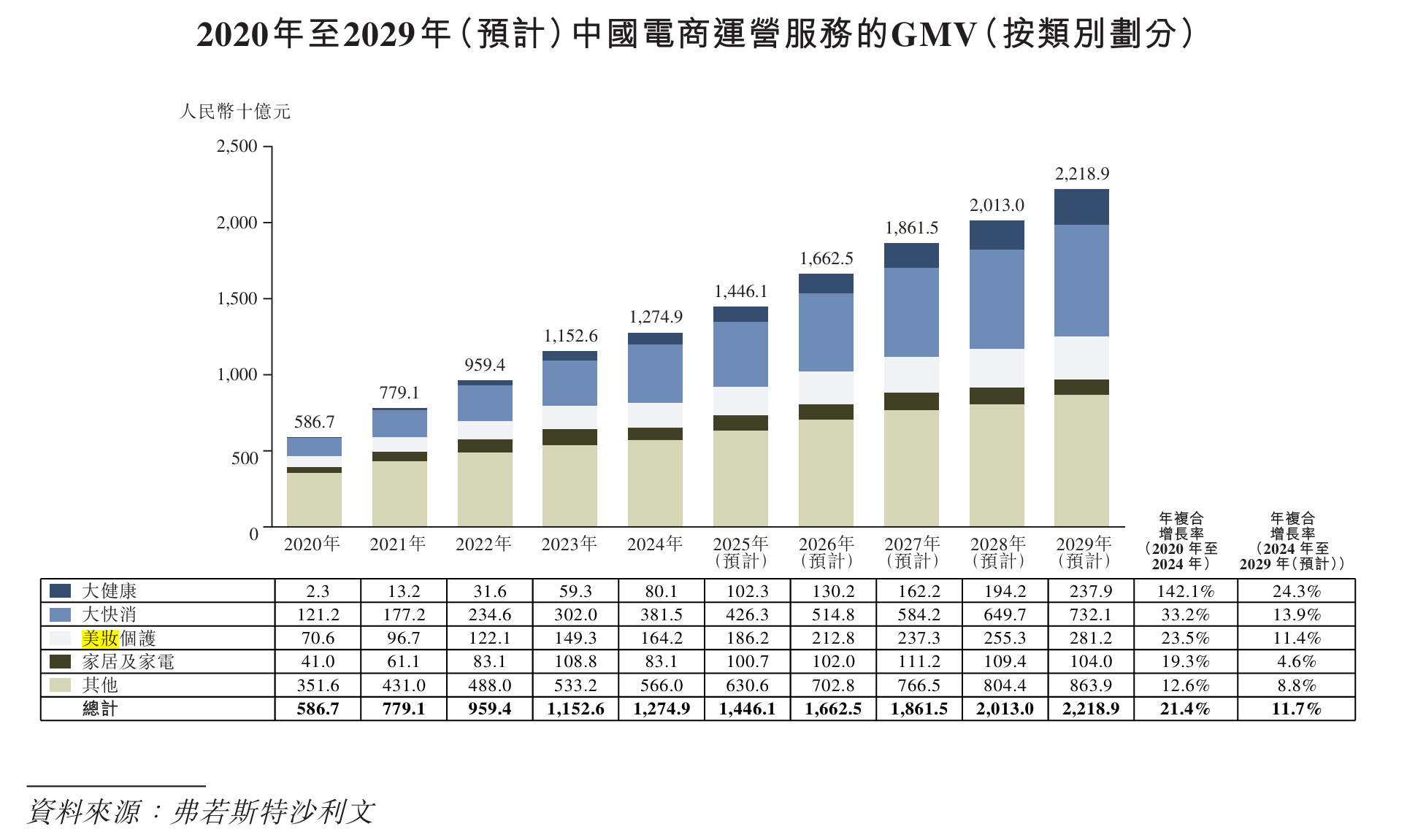 极易科技招股书显示,中国电商运营服务市场整体保持快速增长,总GMV由2020年的5867亿元增至2024年的12749亿元,年复合增长率为21.4%。预计2029年将达到22189亿元,2024年至2029年的年复合增长率为11.7%。