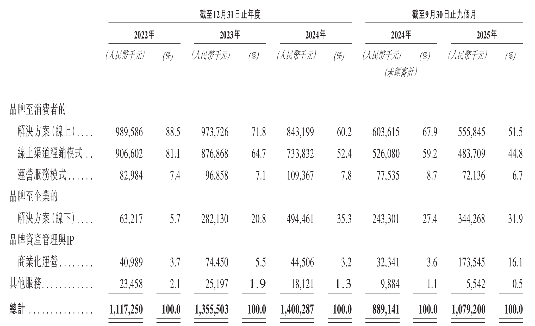 “品牌至消费者的解决方案”收入占比从2022年的88.5%下滑至2024年的60.2%。2025年前三季度,这一业务模式收入占比下滑至51.5%。