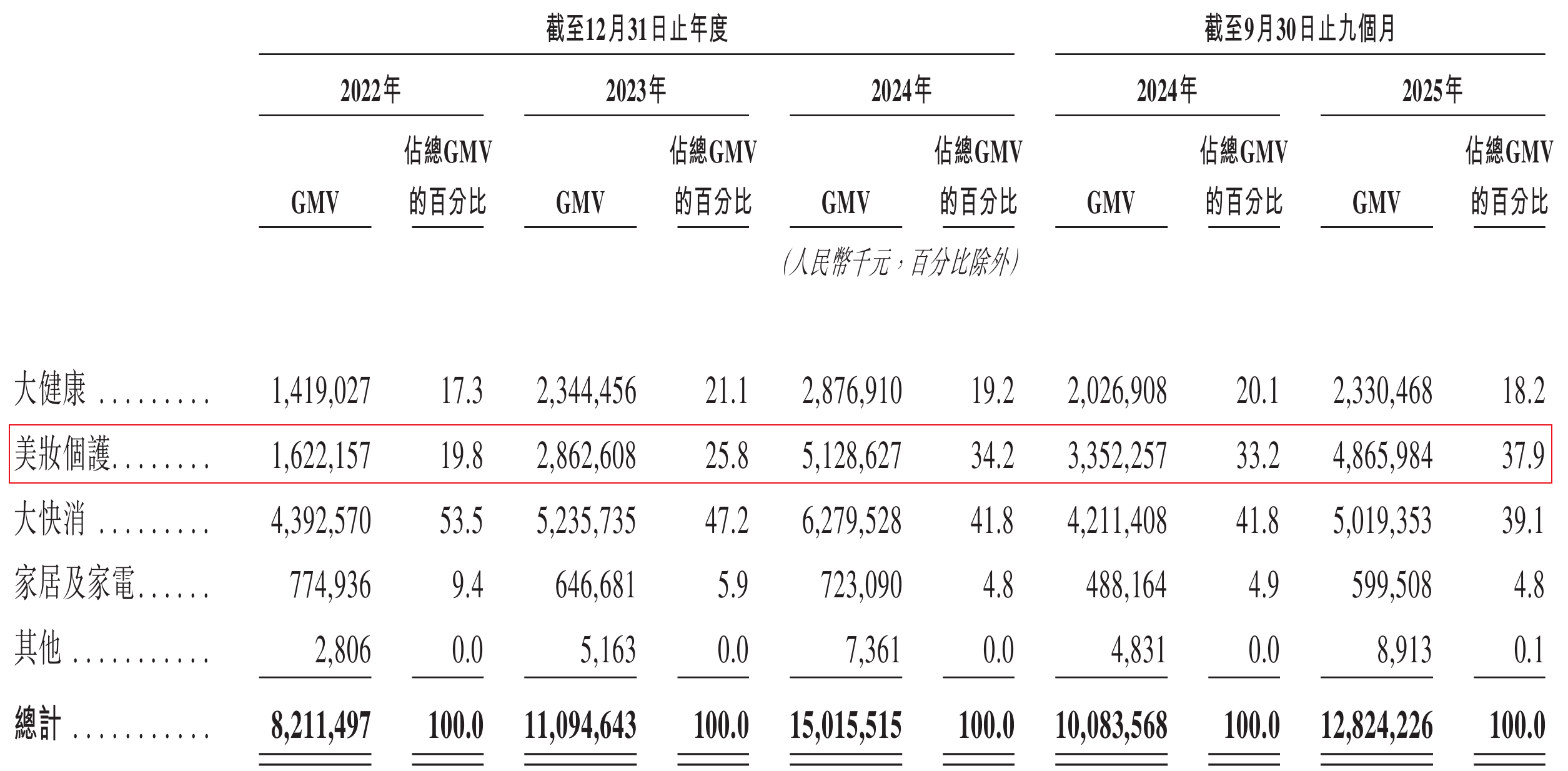 按GMV计算,极易科技旗下的美妆个护类目从2022年的16.22亿元上涨至51.28亿元,占比从19.8%上涨至34.2%。2025年前三季度,这一类目GMV达到48.66亿元,占比达到37.9%。