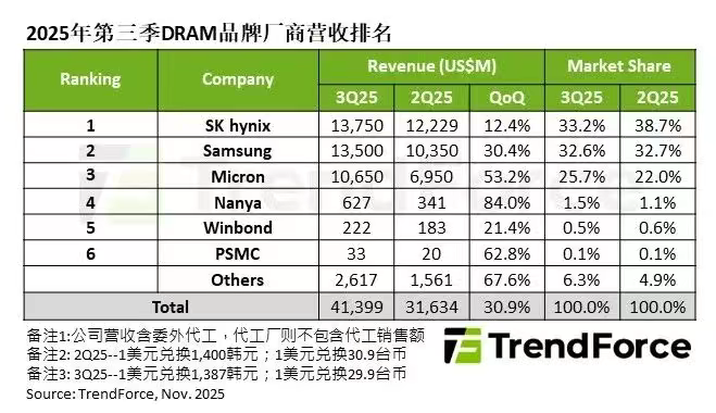 而回望去年第三季度,TrendForce的一组调研显示,通用DRAM合约价上涨、出货量季增,且由于HBM出货规模扩张,推升DRAM产业营收较前一季增长30.9%,达到了414亿美元。