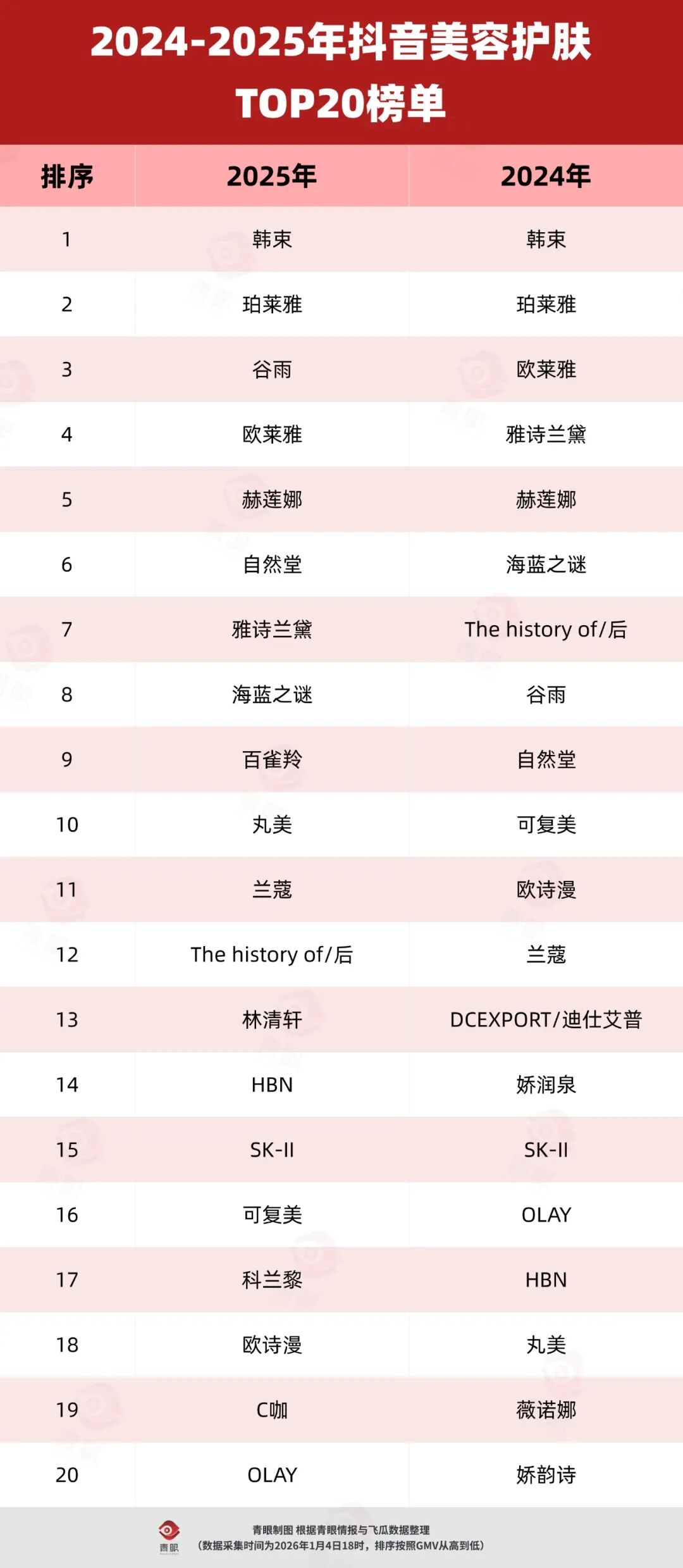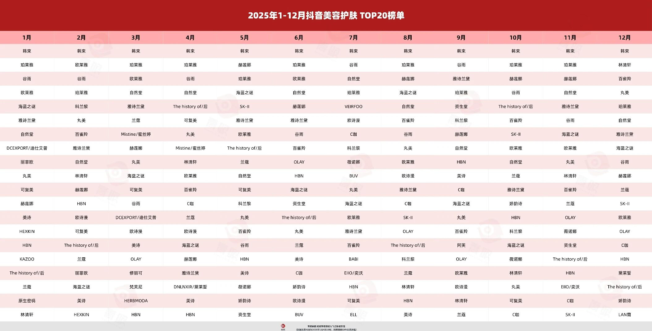 与此同时,百雀羚和C咖在2025年则冲上榜单前列,这是这两大品牌5年内首次登上抖音护肤TOP20年榜。
