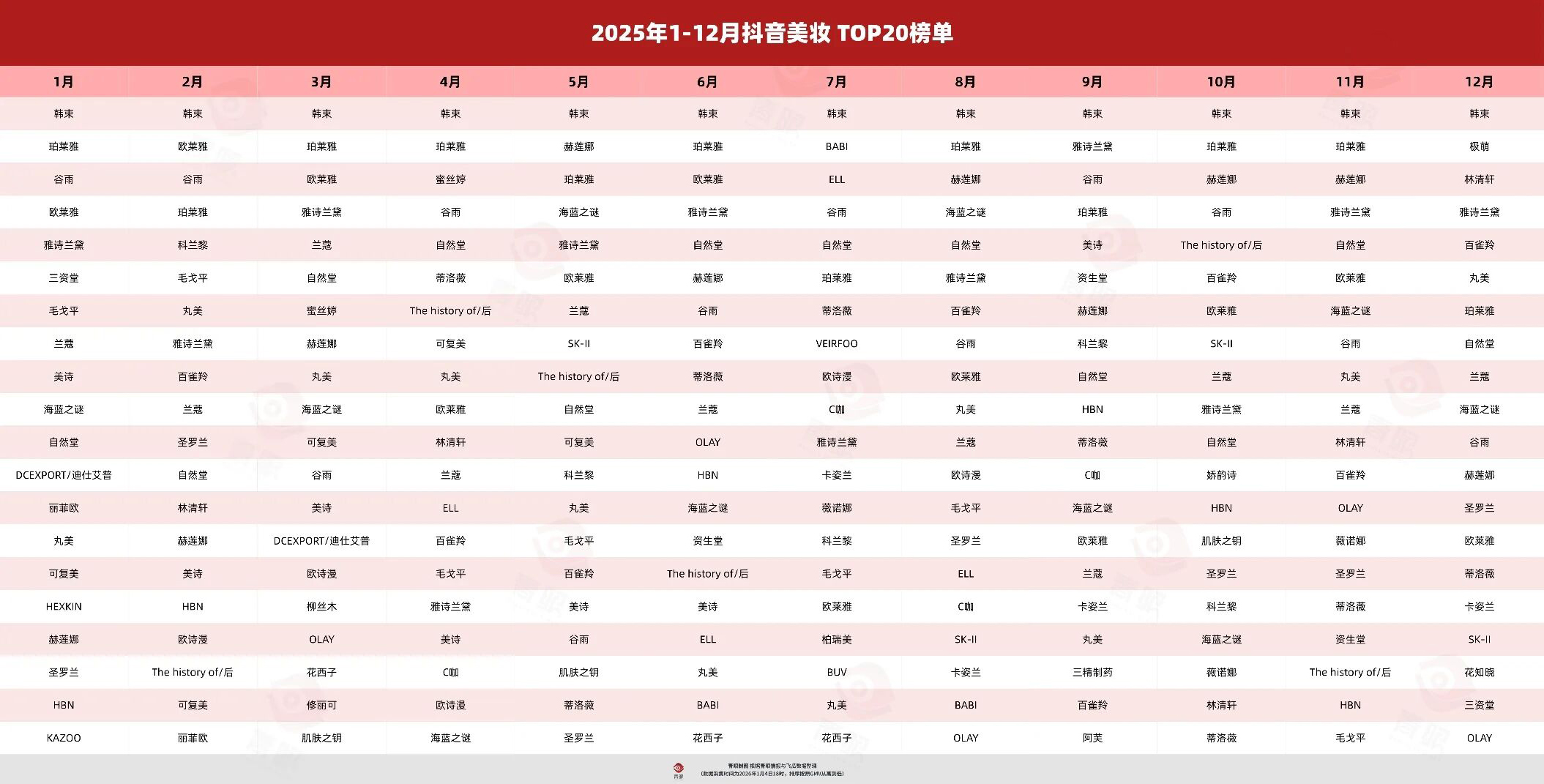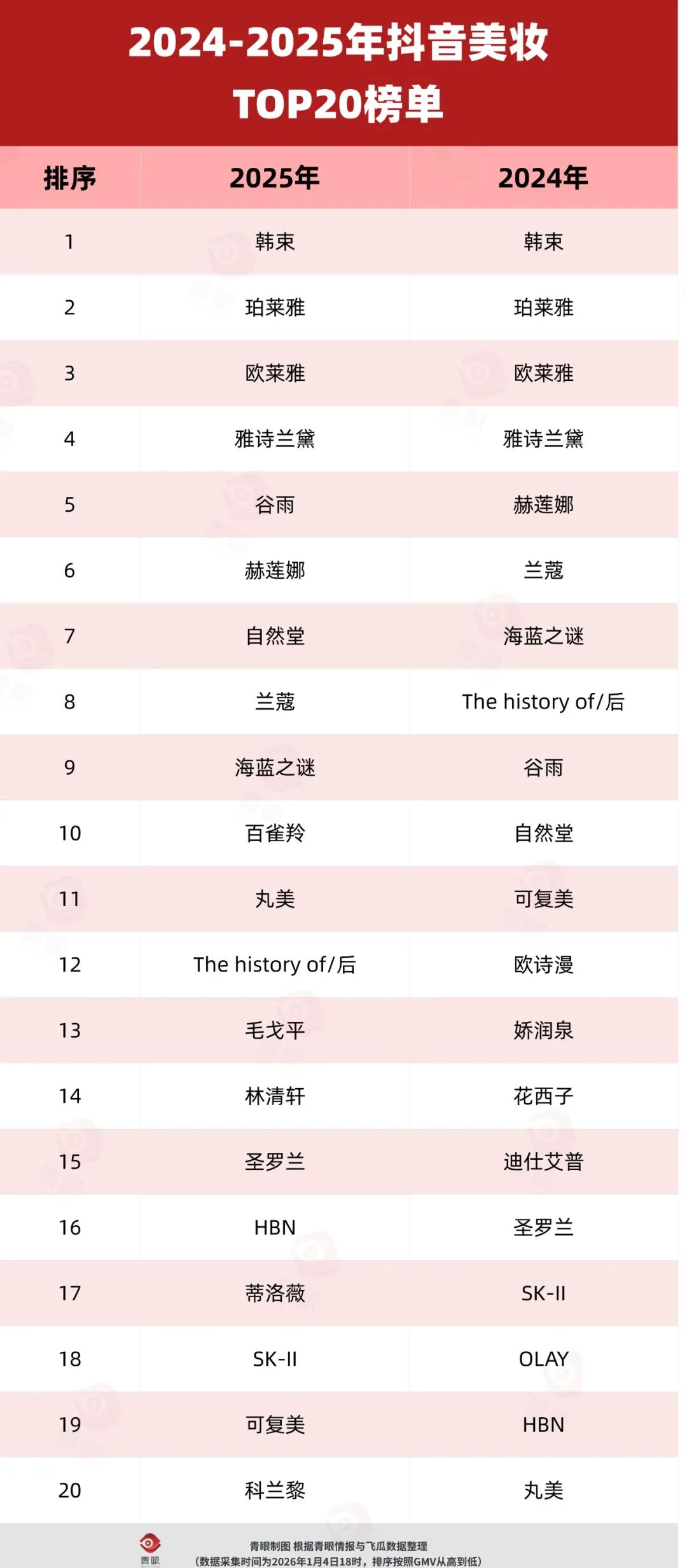 2025年,75%的品牌依旧稳居抖音美妆TOP20行列,尤其是前4大品牌,近两年均由韩束、珀莱雅、欧莱雅和雅诗兰黛牢牢占据。