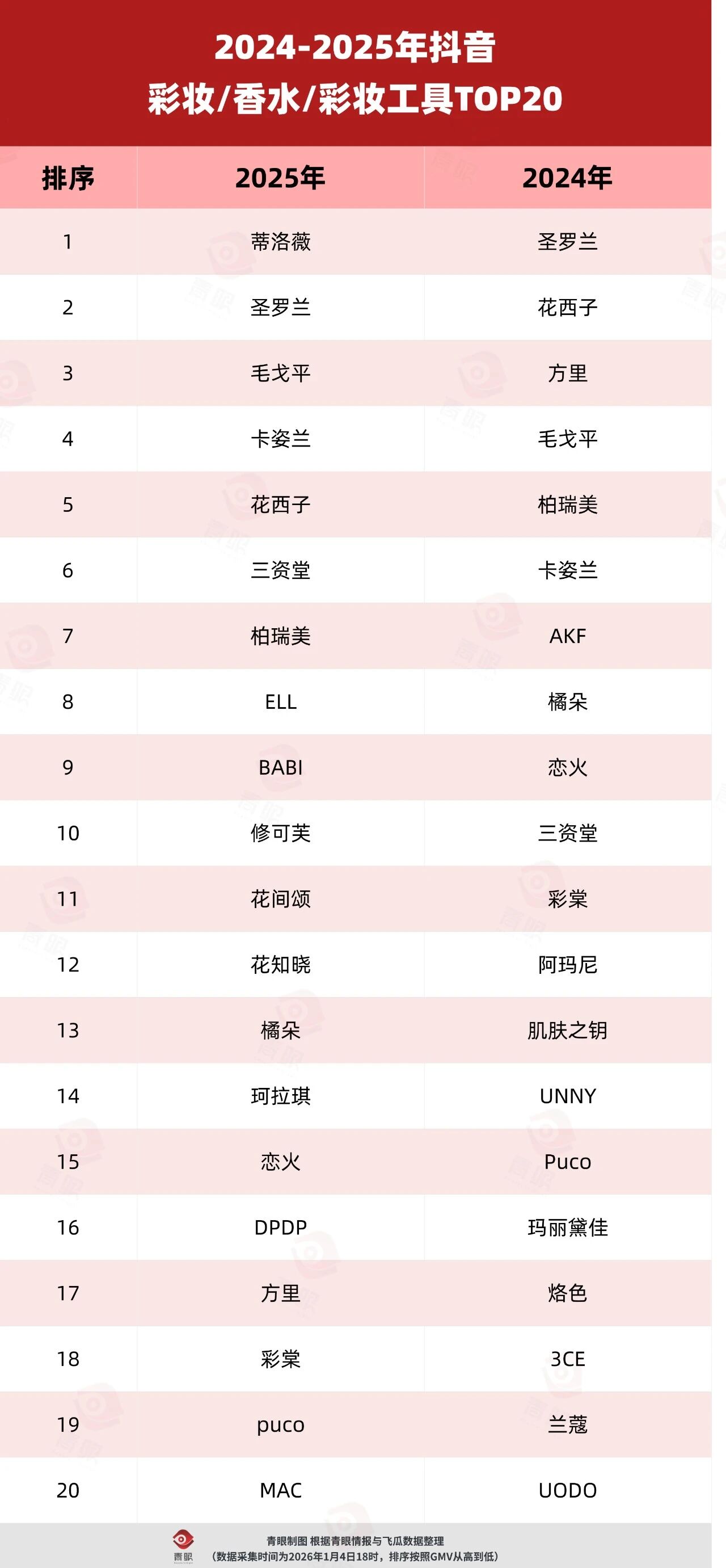 在2024年的抖音彩妆TOP20年榜中,还有包括圣罗兰、阿玛尼、肌肤之钥、3CE和兰蔻5大外资彩妆品牌;到2025年,抖音彩妆TOP20年榜中,就仅剩下圣罗兰和MAC两根“独苗”。