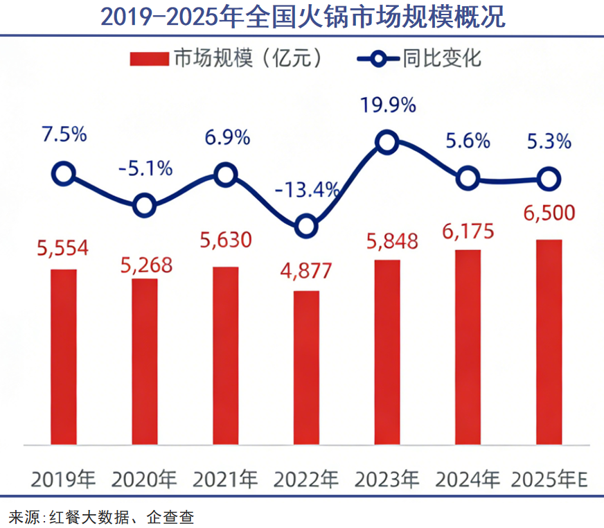 根据红餐大数据的《火锅产业发展报告2025》,2024年全国火锅市场规模6175亿元,同比增长5.6%,这个增幅较2023年的19.9%显著缩水,也低于疫情前7.5%的行业增速。