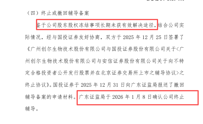 对于终止IPO辅导原因,创尔生物在公告中表示,系“公司股东股权冻结事项长期未获有效解决途径”。因此,经与辅导机构国投证券友好协商,双方于2025年12月25日签署了终止上市辅导的相关协议。随后,国投证券于同月31日向广东证监局报送撤回辅导备案的申请材料。今年1月8日,广东证监局正式确认创尔生物终止辅导。