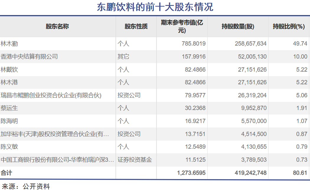 根据公司财报披露的股权关系,东鹏饮料的前十大股东中,林木勤是公司创始人,林木港是其兄弟,林戴钦是其侄子;股东鲲鹏投资的有限合伙人林煜鹏是林木勤之子,股东陈海明、鲲鹏投资的另一有限合伙人陈焕明,则是林木勤配偶陈惠玲的兄弟。