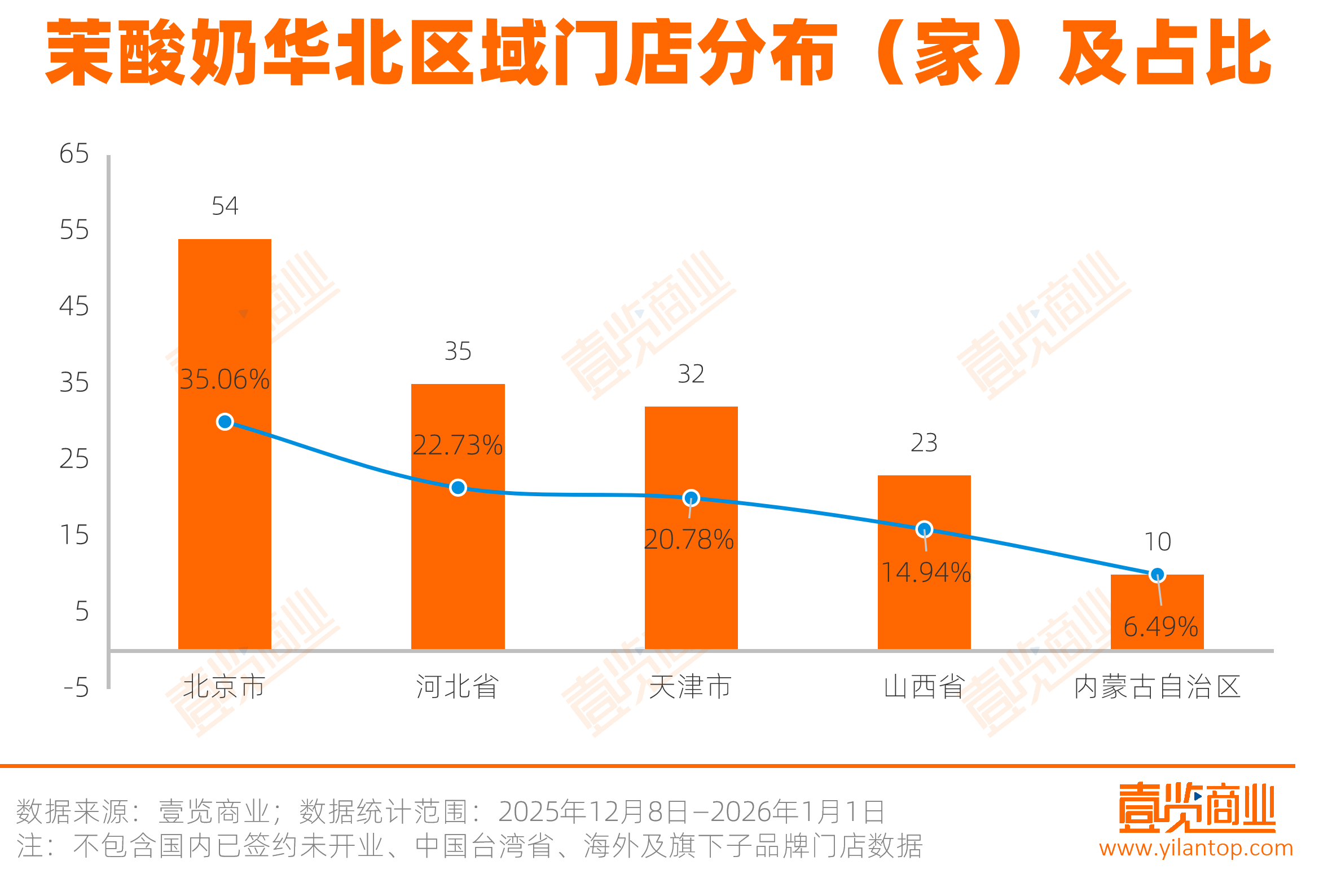 在华北区域,北京以54家门店成为大区核心;河北和天津分别有35家和32家,合计占比43.51%;山西与内蒙古自治区的门店规模明显较小,占比合计仅21.43%。