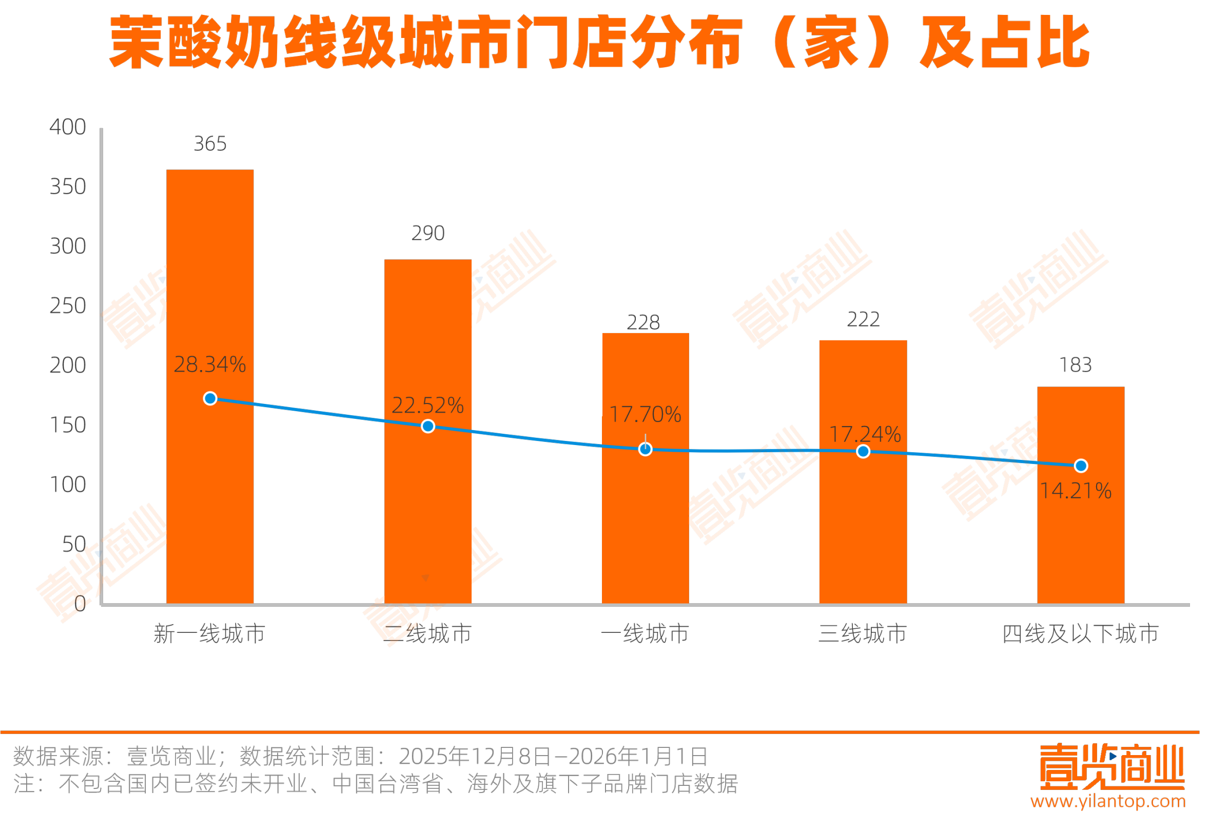 在城市拓展上,茉酸奶明显倾向于高线城市。新一线城市是茉酸奶的绝对核心,以365家门店、占比28.34%的规模居于首位;二线城市以290家门店位列第二,一线城市排在第三。三线及以下城市门店数虽有405家,但分布相对分散,显示出品牌在下沉市场仍处于尝试阶段。