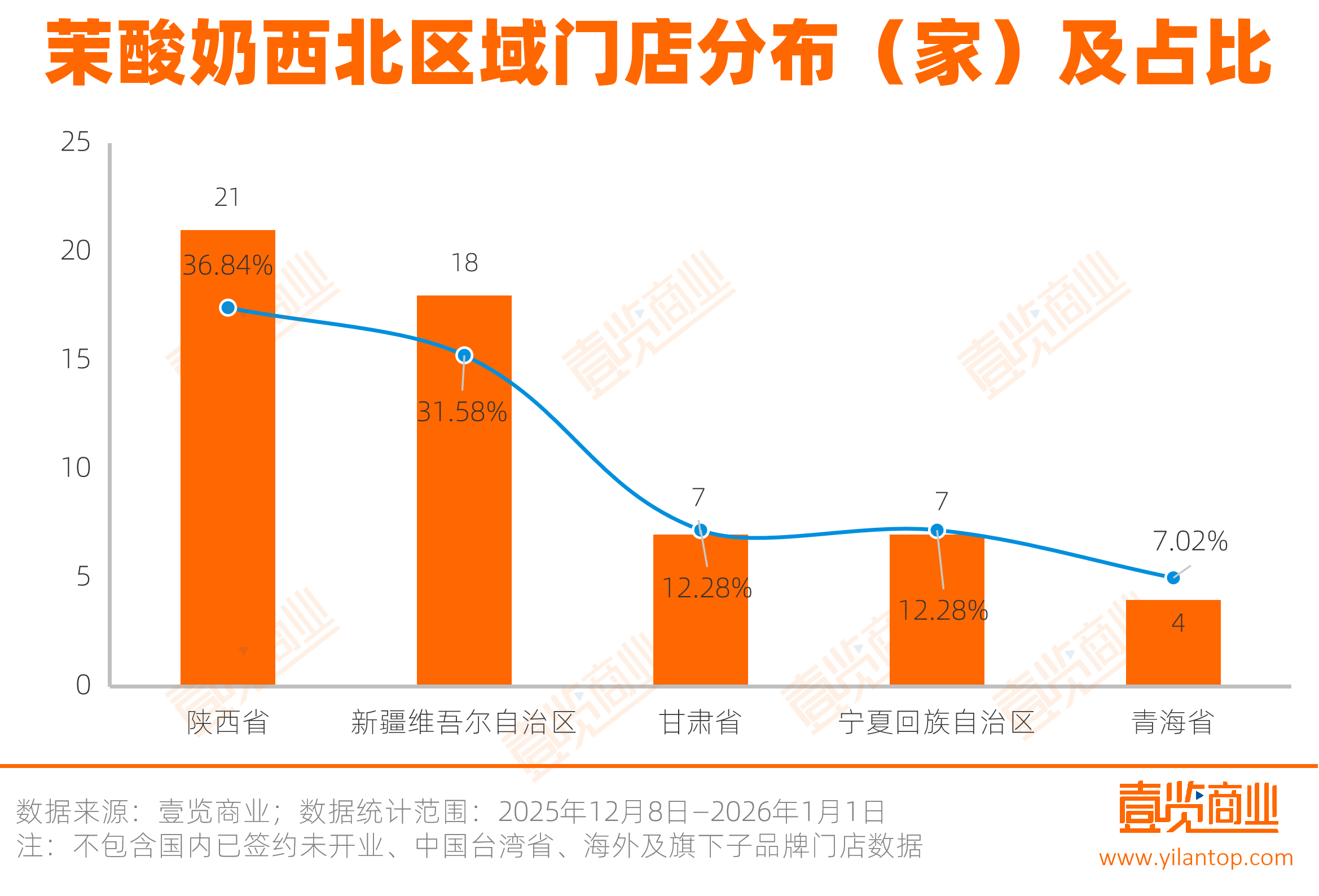 在西北区域,新疆与陕西一起占据了近七成市场,青海是区域内门店数量最少的,只有3家门店。