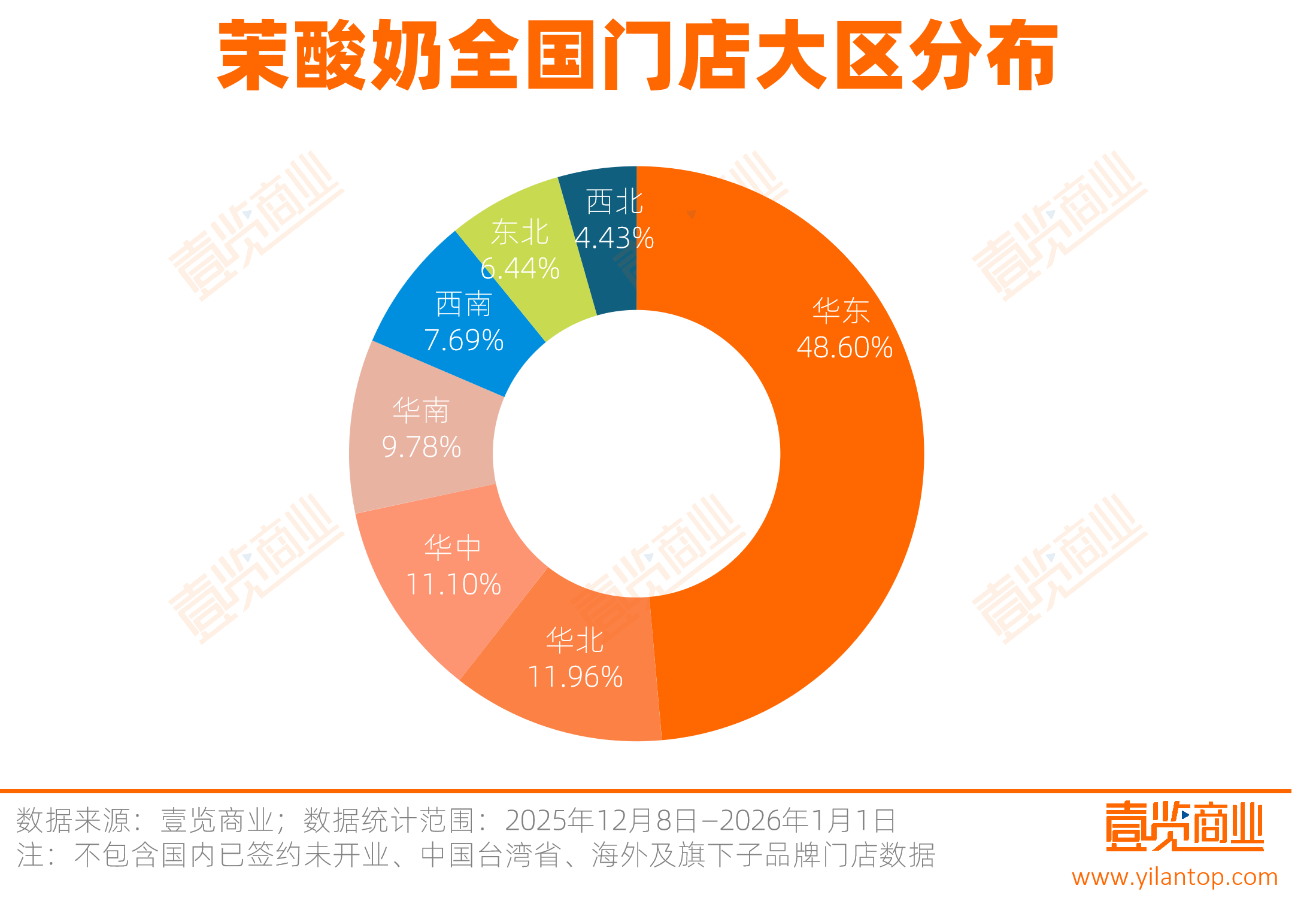 从全国布局来看,茉酸奶高度集中在华东。华东地区以626家门店,占比48.60%,占据了茉酸奶全国近一半的现存门店数量。而华北、华中、华南三个大区共有403家门店,合计占比32.78%,是重要的区域支撑。与之相比,西南、东北、西北三大区域门店总数占比不足两成,市场渗透率都还很低。