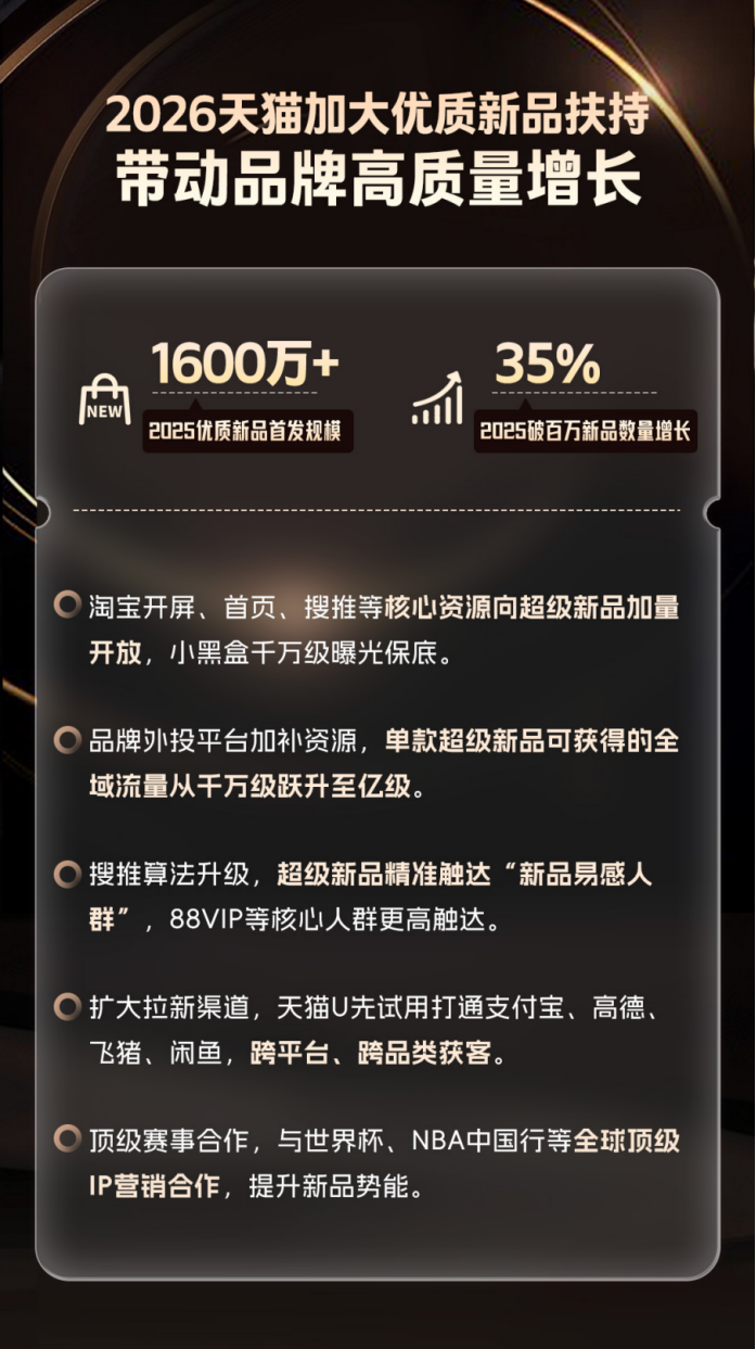 作为品牌新品首发第一阵地,2026年天猫通过更多资源投入、更广人群覆盖、更长周期扶持等,让“新品上市即爆发”更高频,为品牌创造可持续的高质量增长。