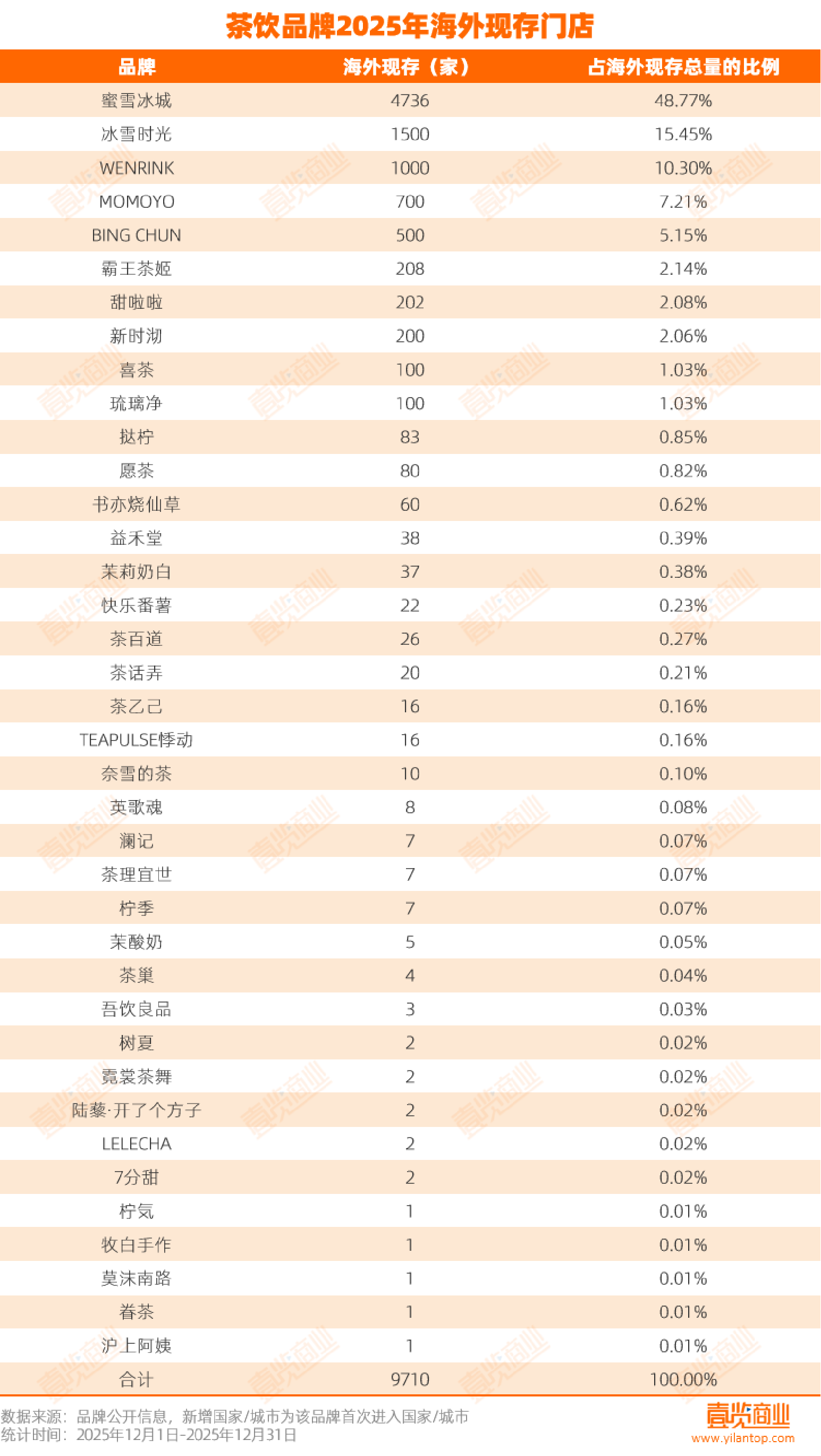 从门店存量看看,截至2025年12月30日,据茶咖观察统计,至少有38个品牌在海外开设了9710家门店。