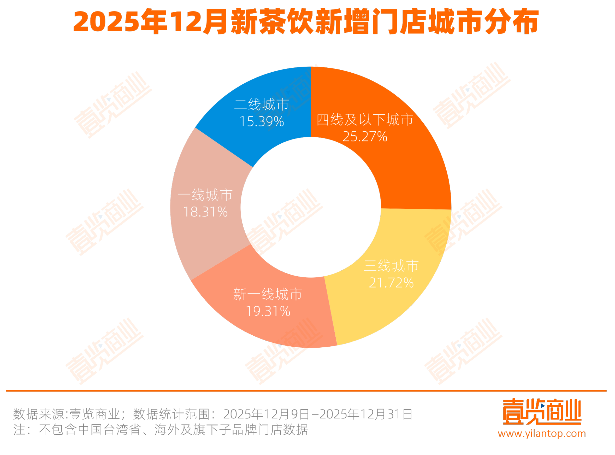 从新增门店的城市分布来看,新茶饮在四线及以下城市新增最多,占比25.27%,这表明下沉市场已成为茶饮拓店的主要来源;三线城市表现同样突出,新增门店占比为21.72%;二线城市新增最少,占比15.39%。