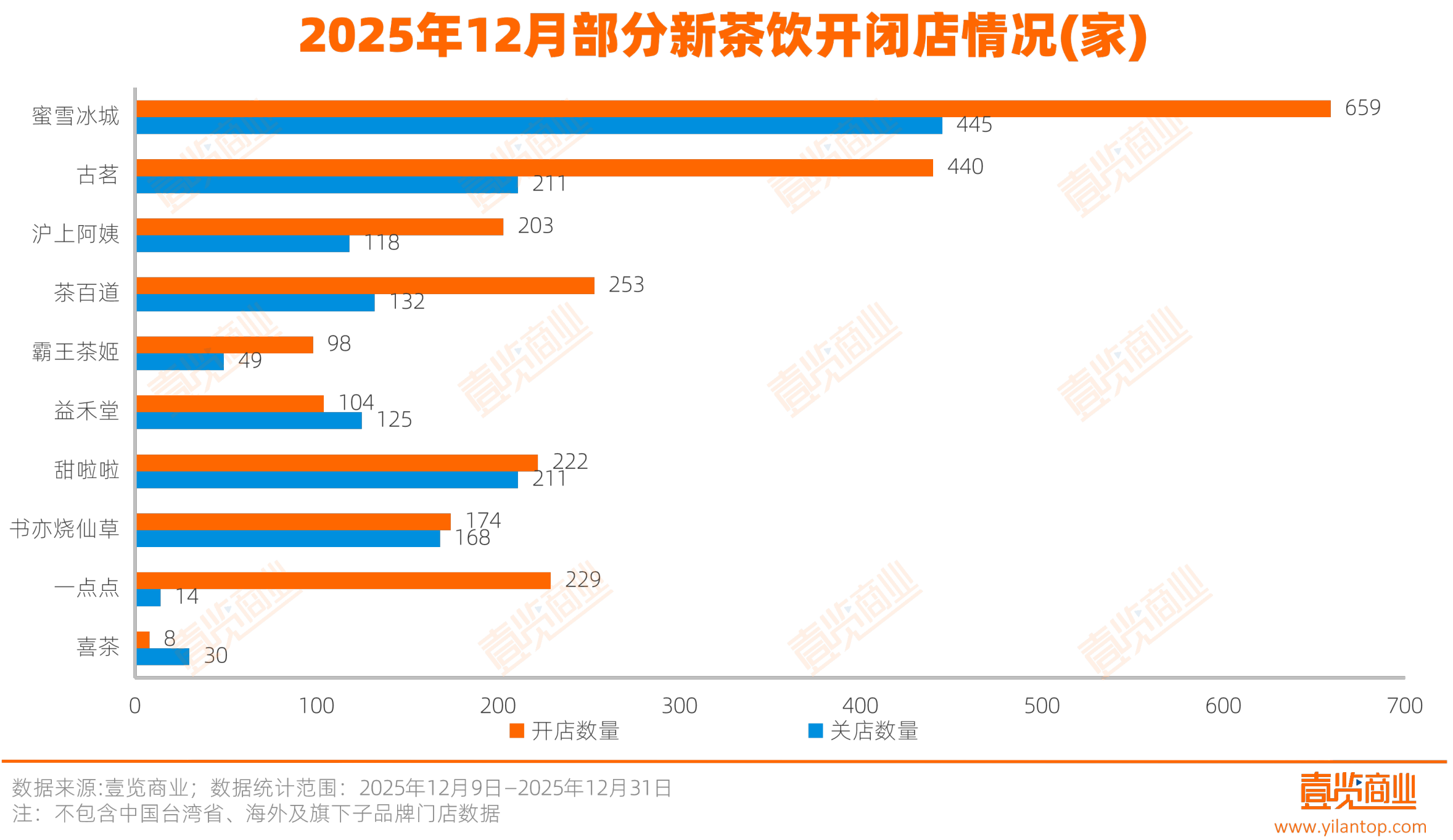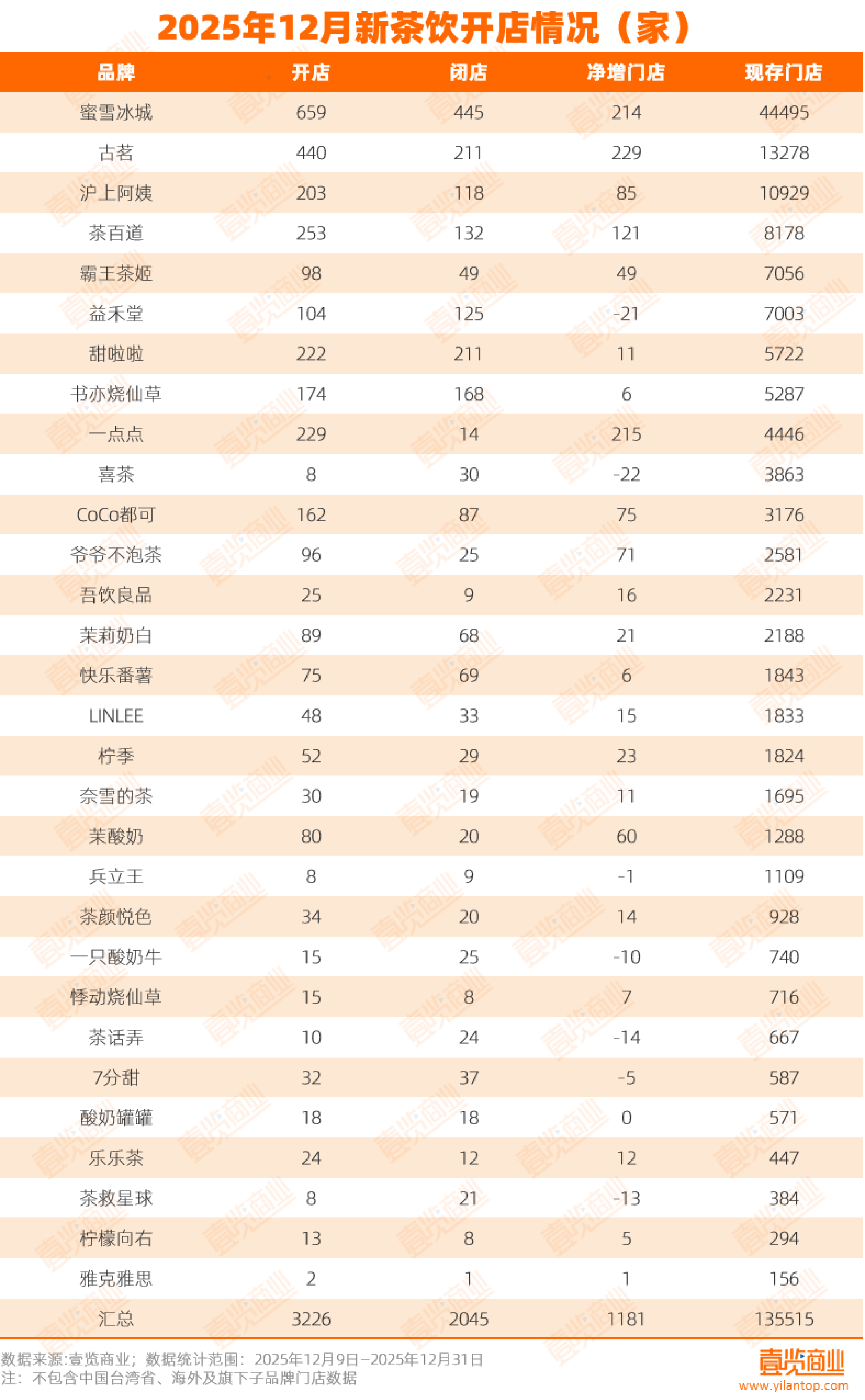 2025年12月,新茶饮门店拓展速度增快。壹览商业监测的30个连锁茶饮品牌合计现有门店总量13.55万家,单月新开3226家、关闭2045家,净增长1181家。