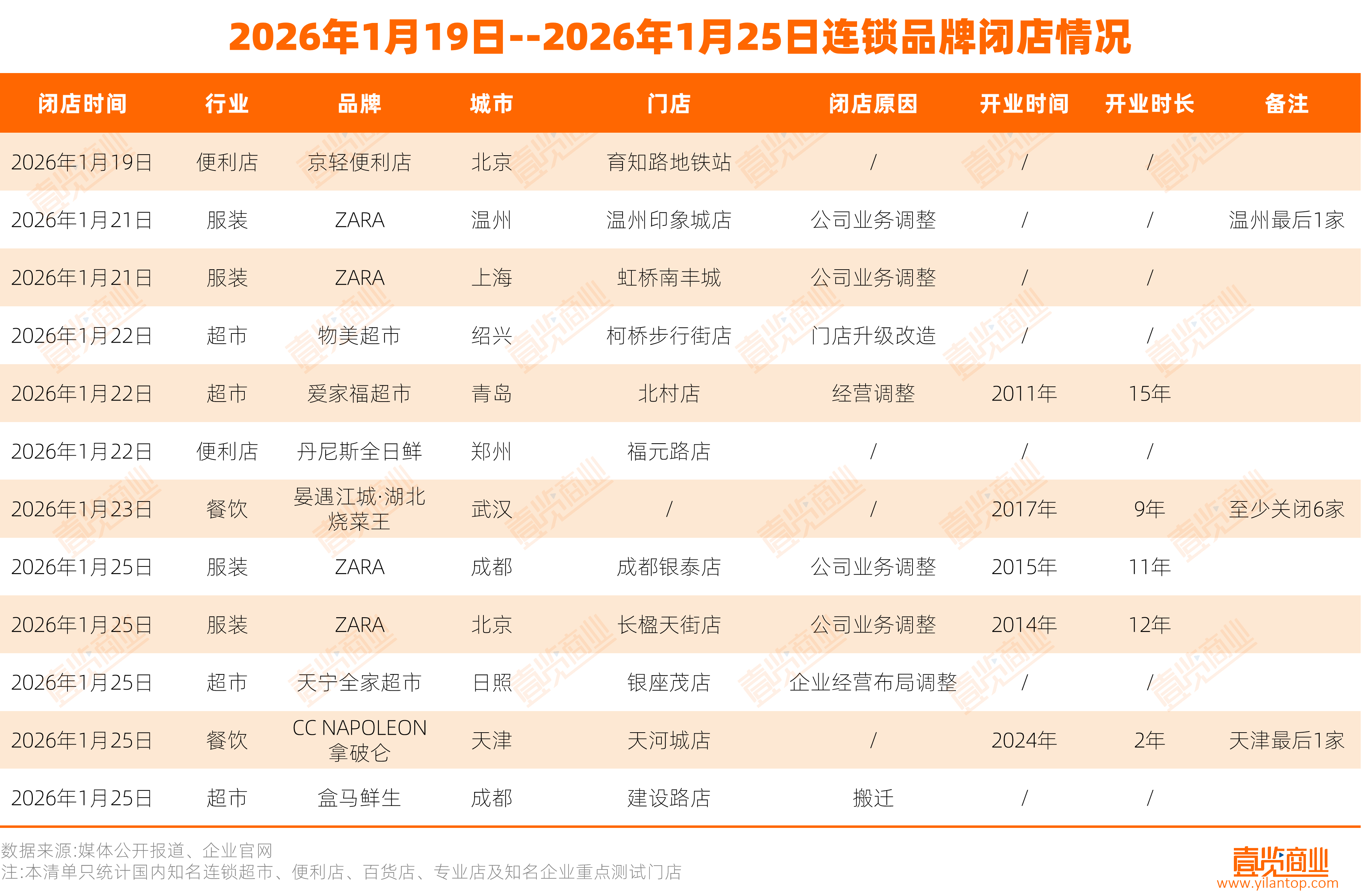 据壹览商业不完全统计,2026年1月19日——2026年1月25日,国内知名连锁超市、便利店、百货店、专业店及知名企业重点测试门店,共有9个连锁品牌关闭了至少18家门店。