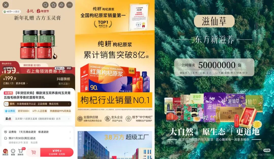 成立仅14个月销售额便超5亿的喜纯,其核心单品古方玉灵膏以“非遗工艺+地道原材料”为标签,上线一年累计销售额就突破亿元。比喜纯晚5个月成立的纯耕,将红黑枸杞原浆的目标人群锁定男性群体,截至目前单品销量已突破8亿袋,也被授予“中宁枸杞”地理标志产品保护。