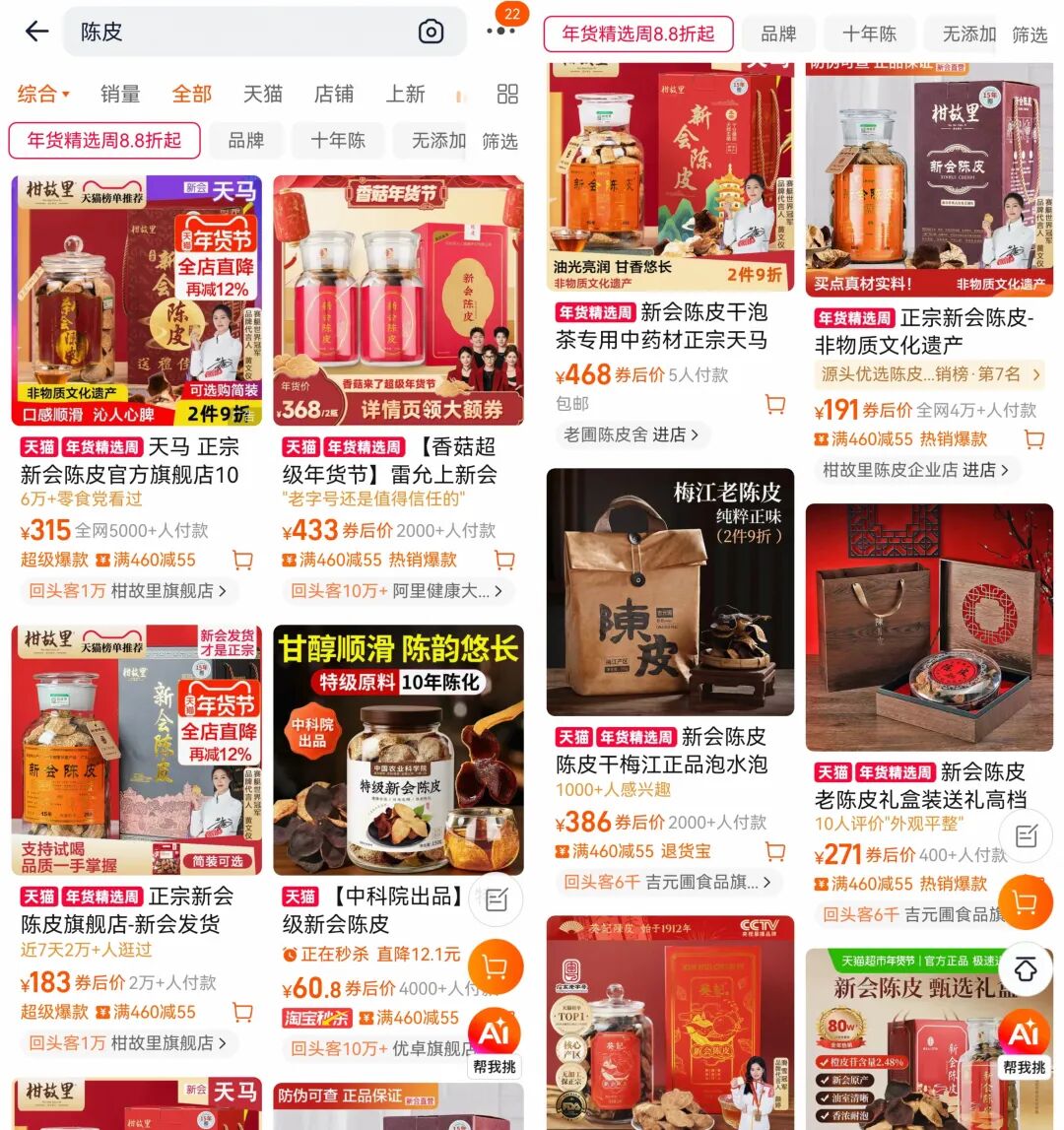 陈皮是药食同源界的“资深网红”,早已成为亿万家庭的养生常客。在淘宝搜索“陈皮”,按照综合排序,排名靠前的多屏产品全部标注了“新会陈皮”字样,与之关联出现的词汇,则是“高端”“正宗”等等。
