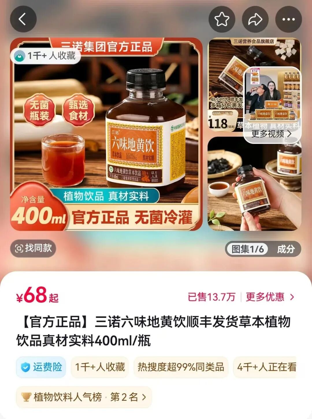 三诺食疗则古方新作,选择了“年轻化”突围路径。其首创的六味地黄饮上线后迅速成为爆款,在抖音平台30天内登顶植物饮料类目销量榜首,5个月内销售额突破1亿元。这款自经典古方六味地黄丸转化而来的创新产品成功打破了年轻人对中药“苦、难喝”的刻板印象,让药食同源走上了年轻人的办公桌。