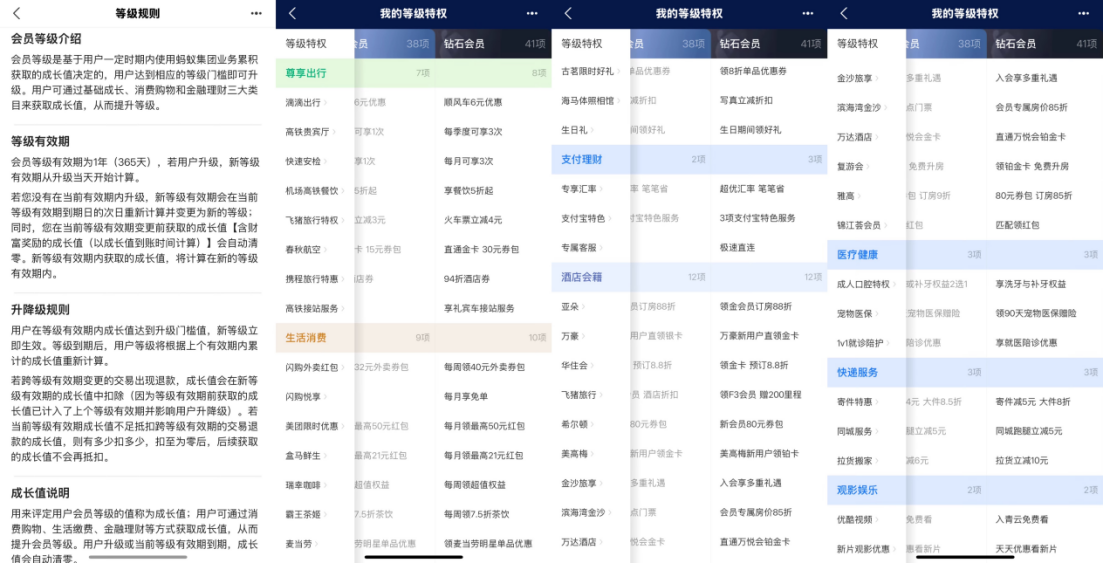 支付宝会员同样有等级和成长值,但成长值来源不止于消费,而是覆盖支付、理财、出行、生活缴费、医疗、快递等一整套账户行为。