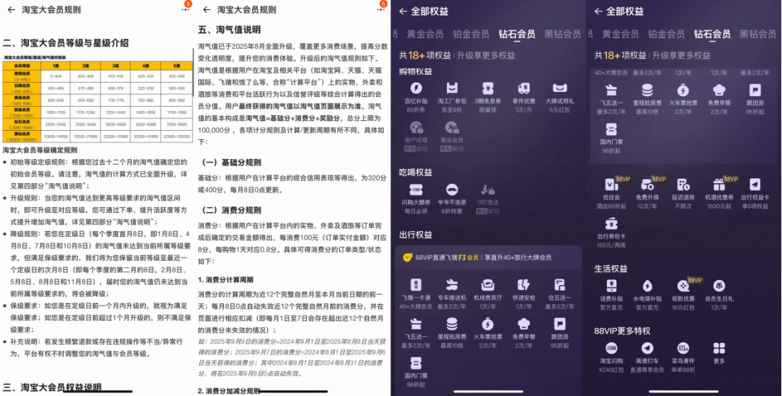 二者在会员权益上的形态也非常接近。淘宝大会员的核心是淘气值。淘气值的计算,明确围绕“在阿里消费”展开,主要由购物金额、购物频次、互动行为构成。买得越多、买得越勤、越活跃,等级越高,权益也就越集中在购物折扣、优惠券、包邮、试用和部分文娱内容上。
