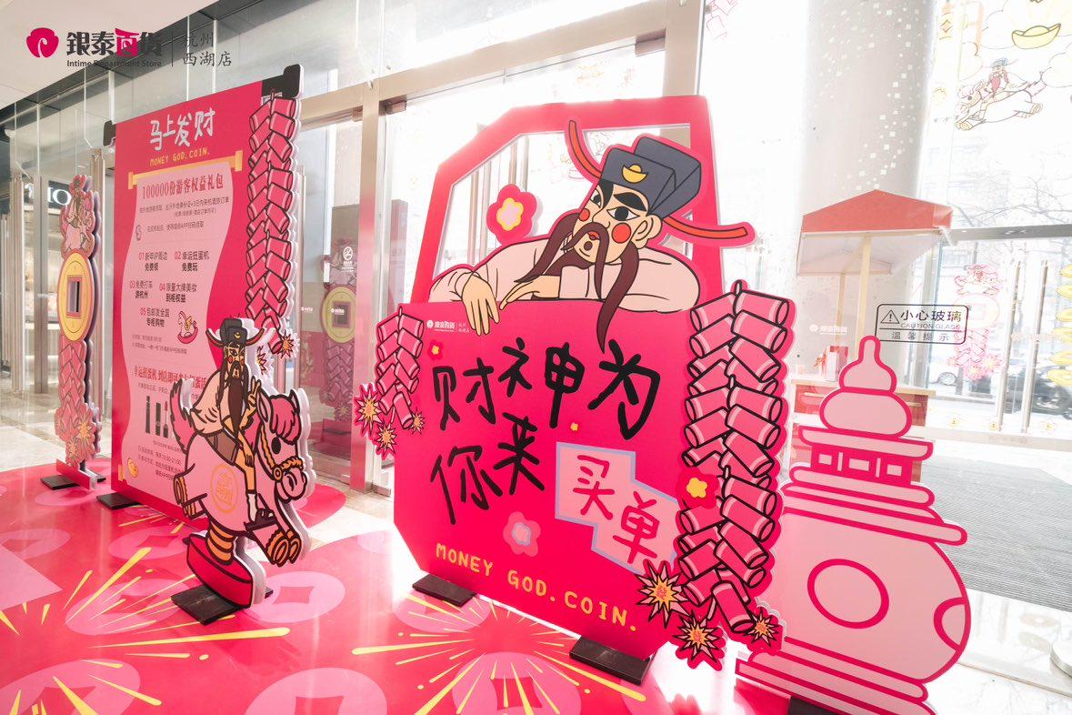 随着新春黄金消费热,杭州银泰百货的黄金珠宝区也成为焦点。在武林银泰百货外广场的“马上发财”打卡点,融合了“曼卡龙与北高峰财神联名全国首展”氛围,联名款“东方庇佑系列”饰品同步首发,传递“马上来财”的美好祝福。