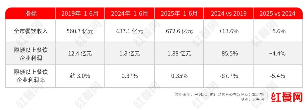 据北京统计局统计,北京全市餐饮收入从2019年1-6月的560.7亿元提升到了2025年1-6月的672.6亿元,但2025年1-6月的餐饮利润相比2019年同期下滑84.8%,从12.4亿下降到了1.88亿。