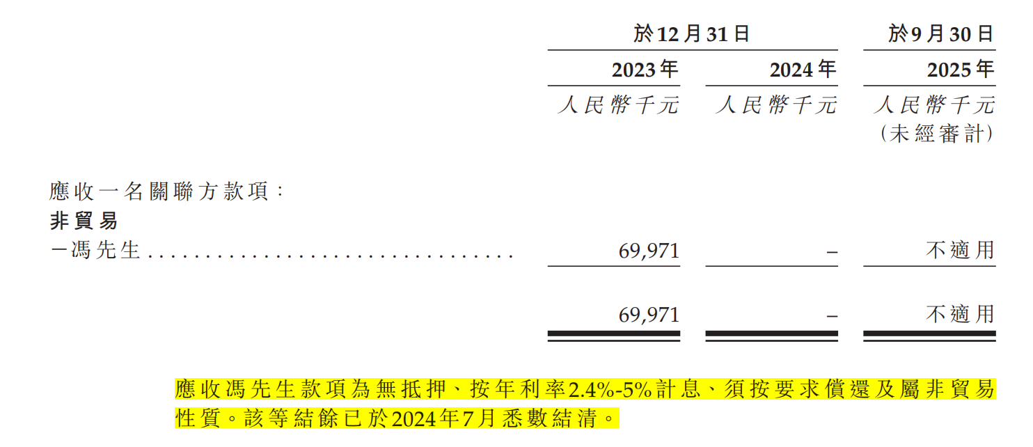 值得关注的是,在此次股权零对价转让前后,冯冀生与钱大妈之间存在多笔大额资金往来。招股书显示,2023年末,钱大妈从冯冀生处获得的贷款利息收入为612.6万元,按照招股书披露的2.4%-5%利率范围估算,冯冀生对钱大妈的借款规模在1.23亿元至2.55亿元之间;同时,钱大妈应收冯冀生借款余额为6997.1万元。2024年,钱大妈又向冯冀生出借450万元,相关利息收入达257.5万元。