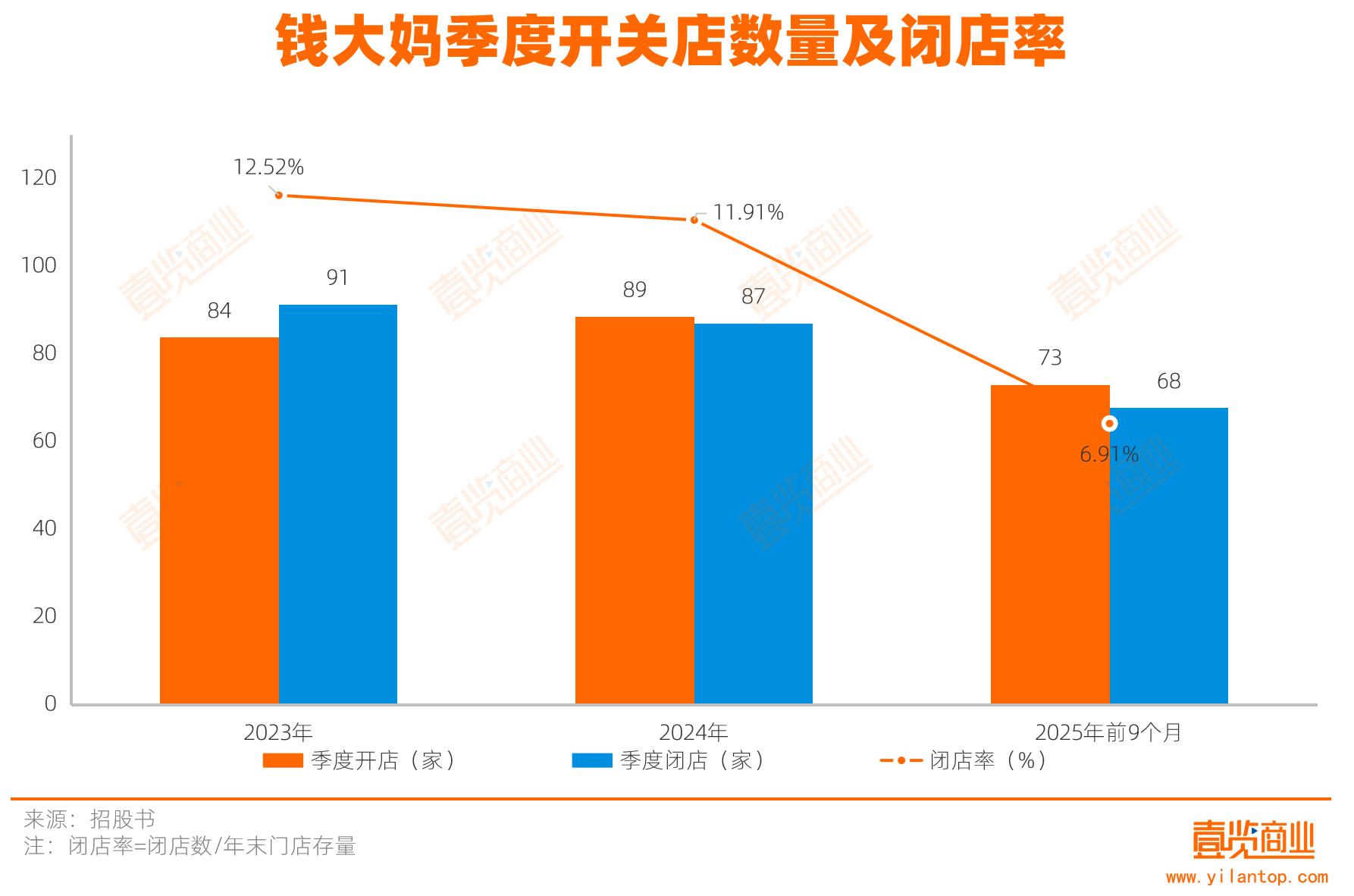 第一,门店网络增长已停滞。钱大妈的总门店数连续三年维持在2900家左右,累计新开908家、关闭916家,属于“开一家、关一家”的高频更替。尽管闭店率有所下降,运营趋于稳定,但总量上已失去扩张动力。总闭店率从2023年的12.52%降至2025年前9个月的6.91%,季度平均闭店数也从91家降至68家。