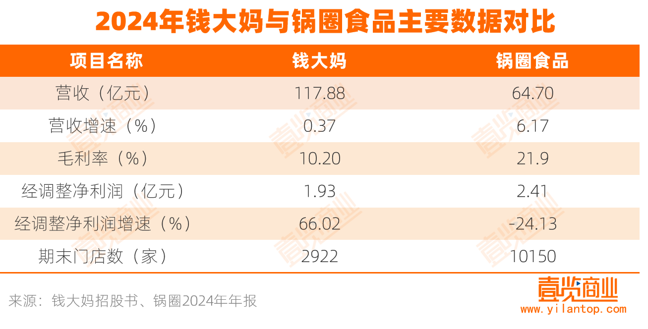 为评估其估值合理性,可对比同为食材零售商,且都已加盟模式扩张的锅圈食品。为保证对比的客观性,以下数据均采用2024年年度数据。