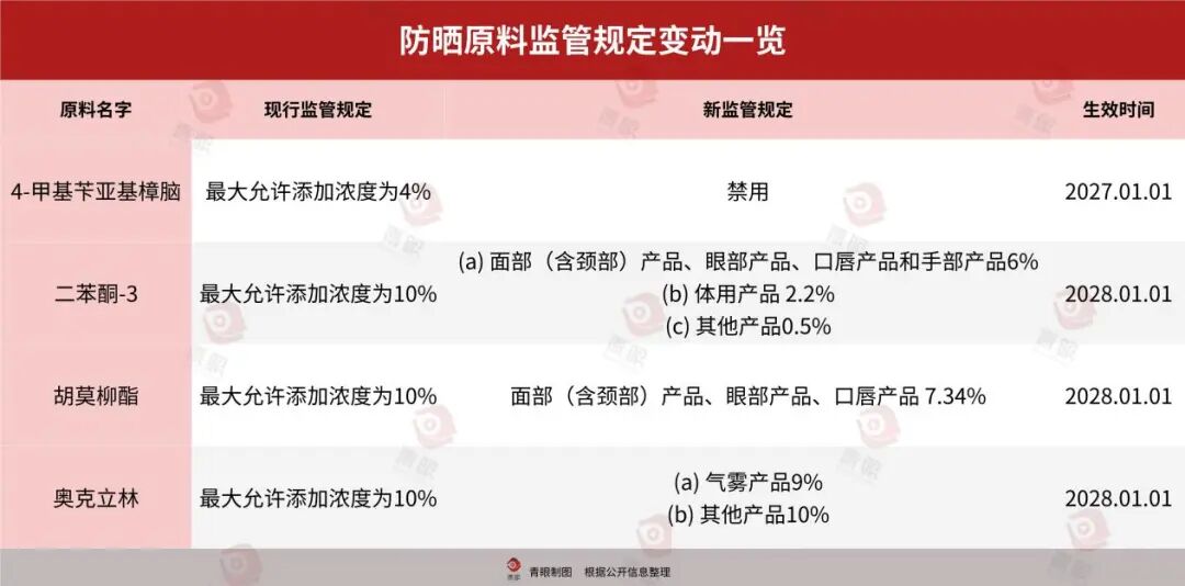 同样在该公告中,国家药监局还将二苯酮-3、胡莫柳酯、奥克立林三种防晒剂成分在化妆品中的最大允许使用浓度进行了修改,均有所下调,相关规定自2028年1月1日起实施。