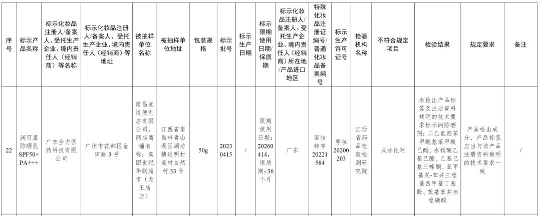 本次通告内容显示,如标示广东全力医药科技有限公司生产的“润可盈防晒乳SPF50+PA+++”(注册证号:国妆特字20221584),其不合格批次产品中未检出产品标签及注册资料载明的技术要求标示的防晒剂为:二乙氨羟苯甲酰基苯甲酸己酯、水杨酸乙基己酯、乙基己基三嗪酮、亚甲基双-苯并三唑基四甲基丁基酚、苯基苯并咪唑磺酸。不难看出,仅一款防晒产品,竟缺少了5种防晒剂成分。