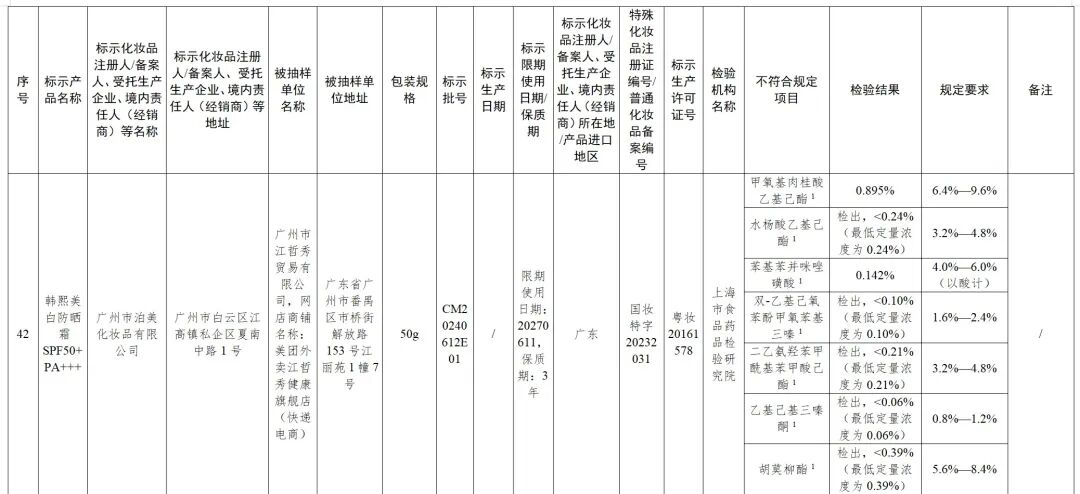 比如,该产品中“甲氧基肉桂酸乙基己酯”规定浓度要求应为6.4%—9.6%,但仅检出0.895%的浓度。二者相去甚远,即存在“缺斤少两”的行为。